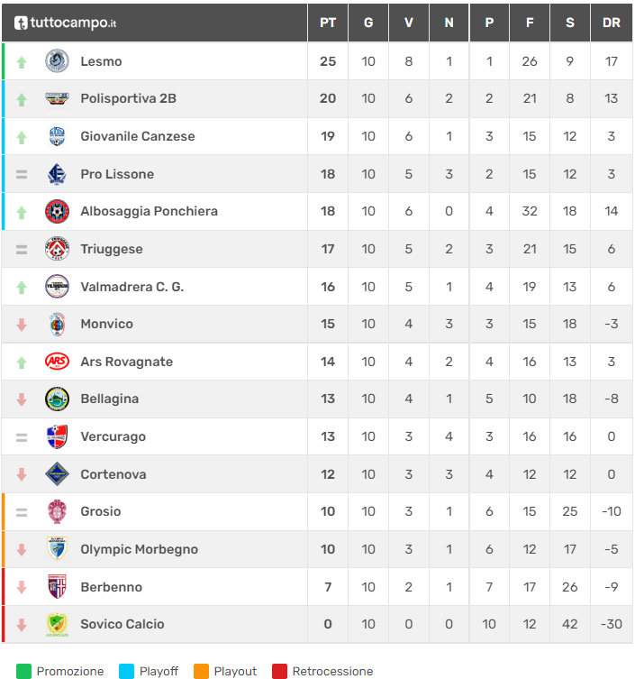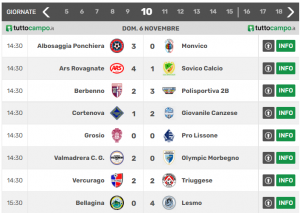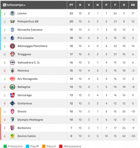 Il decino turno del girone C di Prima Categoria lombarda ha recentemente dato i suoi esiti. Partiamo dalla vittoria della Polisportiva 2B in casa del Berbenno nella zona rossa della classifica(2-3): con i tre punti realizzati in Valtellina la società di Brivio continua ad inseguire la vetta che dista 5 lunghezze ed è occupata ancora dal Lesmo. Nel derby locale di giornata il Valmadrera temporaneamente a meno due dalla quota playoff batte 2-0 tra le mura amiche l’Olympic Morbegno che è in zona playout a 10 lunghezze. Il Rovagnate invece si colloca in una terra di mezzo in termini di piazzamento in graduatoria dato che è a 4 lunghezze sia dai playout che dai playoff. Situazione in campionato dovuta anche al 4-1 interno dei biancorossi contro il fanalino di coda Sovico ancora a secco di risultati. Subito sotto il Rovagnate abbiamo Bellagina e Vercurago a pari merito: nello specifico i gialloneri hanno subito in casa un poker dalla capolista Lesmo, mentre i rossoblù hanno pareggiato sul loro campo con la Triuggese a distanza minima dagli spareggi promozione. Scendendo ancora più in basso c’è il Cortenova che sormonta i playout di due punti e che è stato sconfitto nel proprio fortino da una Canzese terza con 19 punti. Di seguito vengono proposti i risultati dell’ultima giornata di campionato e la classifica del raggruppamento: