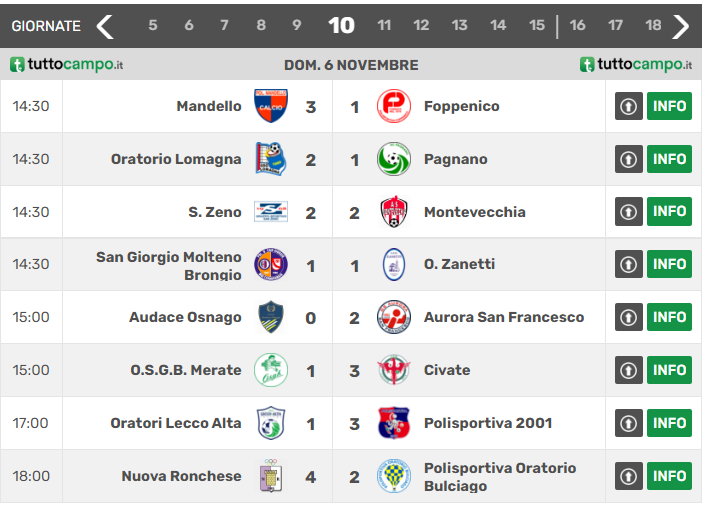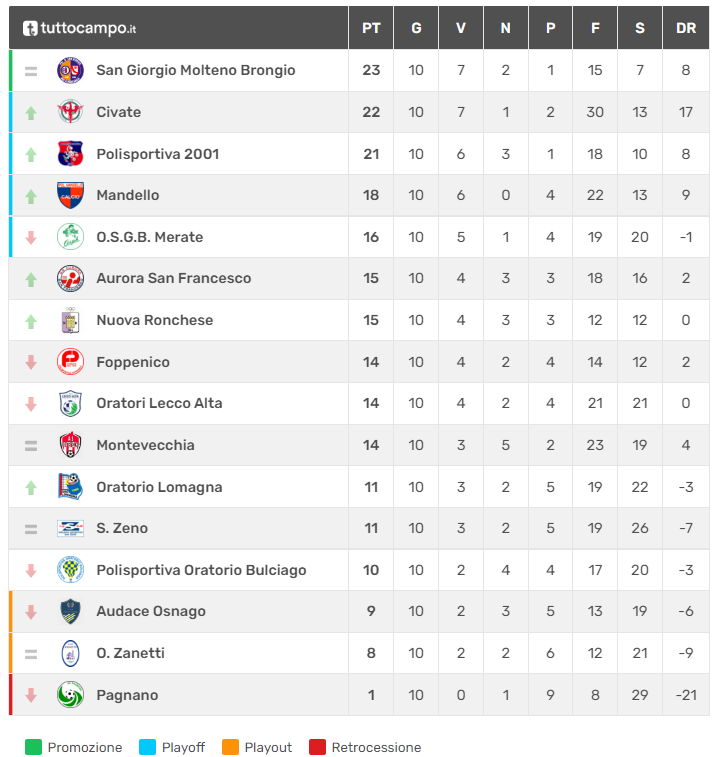 Nel decimo turno del raggruppamento lecchese di Seconda Categoria il Civate si porta a distanza minima dalla capolista Molteno: in particolare gli arancioneri hanno realizzato un punto interno con la Zanetti attualmente in zona playout, mentre l’inseguitrice ha fatto bottino pieno in casa con il Merate in fascia playoff a quota 16 punti. Attenzione però anche alla Pol.2001 che è a meno due dalla testa della classifica e ha vinto 1-3 al Bione con un Lecco Alta voglioso di insediarsi nella fascia degli spareggi promozione. A 18 punti c’è il Mandello quarto e che ha totalizzato tre punti casalinghi contro un Foppenico attualmente a pari merito con Lecco Alta e Montevecchia a un paio di lunghezze dai playoff. Subito sotto la fascia playoff si trovano Aurora San Francesco e Nuova Ronchese: i primi domenica hanno messo in cascina una vittoria in trasferta con un Osnago in zona degli spareggi salvezza, mentre i secondi hanno messo a segno un poker casalingo con un Bulciago in comfort zone (4-2). La gara tra un San Zeno a pari punti con il Lomagna e il Montevecchia si è chiusa sul 2-2: dunque la compagine di casa racimola un prezioso punto che le permette di mantenere le due lunghezze di distanza dai playout. Il Lomagna al momento è uscito dalla zona degli spareggi salvezza grazie al 2-1 interno contro il Pagnano ultimo. Di seguito vengono proposti i risultati dell’ultima giornata di campionato e la classifica del girone: