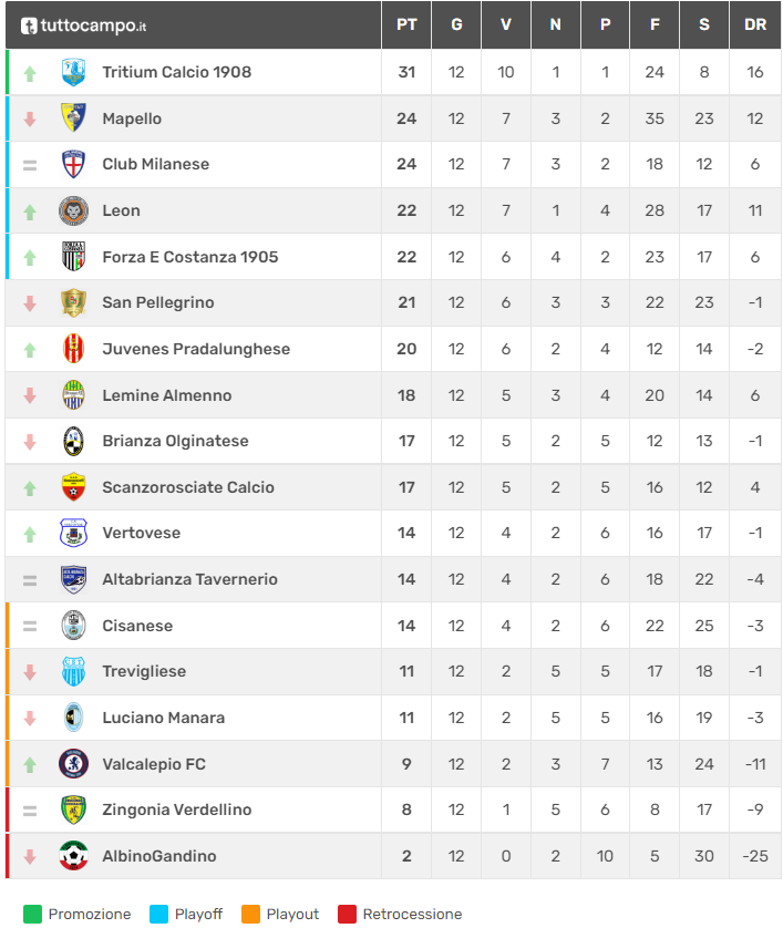In occasione dell’undicesima giornata del girone B di Eccellenza lombarda i ragazzi di Abaterusso giocheranno sabato sera tra le mura amiche contro la Tritium prima in classifica dopo aver battuto domenica scorsa in terra bergamasca l’AlbinoGandino fanalino di coda(0-2) portando a casa il secondo bottino pieno stagionale. Quest’ultimo si va quindi a sommare con la pesante e sorprendente vittoria interna di fine mese scorso nel derby con la Brianza Olginatese(2-1). Attualmente i lecchesi sono nella fascia degli spareggi salvezza a quota 11 punti a pari merito con la Trevigliese dunque a tre lunghezze sia dalla zona retrocessione che dalla salvezza. I milanesi a quota 31 punti invece vengono dal pari interno contro il Forza e Costanza(2-2) a quota playoff alla pari con il Leon, ma bisogna considerare che i primi della classe vantano già una considerevole distanza dal secondo posto temporaneamente occupato da Mapello e Club Milanese a meno sei dalla vetta. Curiosamente le due squadre hanno gli stessi colori sociali ovvero il bianco e l’azzurro, ma si differenziano in termini di organico: infatti provare a fare risultato per la Luciano Manara sarà difficile nonostante il fattore casa, ma anche le grandi possono cadere.