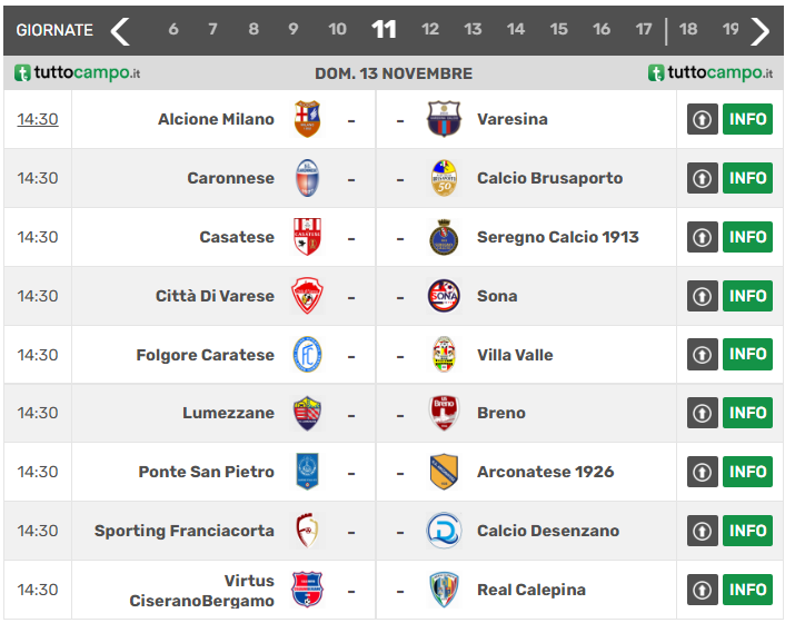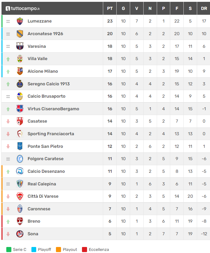 La capolista Lumezzane a quota 23 punti a breve sfiderà in casa il Breno penultimo in una gara almeno sulla carta alla portata per continuare a mantenere la vetta. Vertice della classifica che l’inseguitrice Arconatese ora a meno tre dai rossoblù cercherà di insidiare provando a vincere in trasferta contro il Ponte San Pietro attualmente in comfort zone. Varesina–Alcione potrebbe essere una sfida più combattuta ed interessante: infatti i due club sono nella fascia playoff a distanza minima l’uno dall’altro. Al terzo posto al momento oltre alla Varesina c’è anche il Villa Valle a 18 lunghezze: in particolare i giallorossi saranno di scena a Carate Brianza con la squadra locale che attualmente veleggia tra la salvezza e i playout. Virtus CiseranoBergamo e Brusaporto domenica scenderanno in campo contro squadre in zona playout contro cui quindi potrebbero fare risultato se non viene sottovalutato l’impegno: i rossoblù giocheranno tra le mura amiche con la Real Calepina, mentre i gialloblù affronteranno in trasferta la Caronnese. Lo Sporting Franciacorta se la vedrà contro il Desenzano a 11 punti con la Folgore Caratese per tentare di dare una svolta ad un periodo negativo. Chiudiamo con la sfida dei bassifondi della graduatoria tra un Varese alla ricerca di punti per uscire dalla zona degli spareggi salvezza e il Sona fanalino di coda. Di seguito vengono proposte le prossime sfide e la classifica del girone B di Serie D: