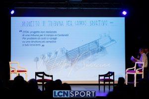 Gianni Menicatti, storico che ha curato la mostra dedicata allo stadio esposta in Biblioteca, ha mostrato una planimetria della città del 1925 che mostra come lo stadio sia stato letteralmente costruito tra i prati, poi ha elencato le date chiave: