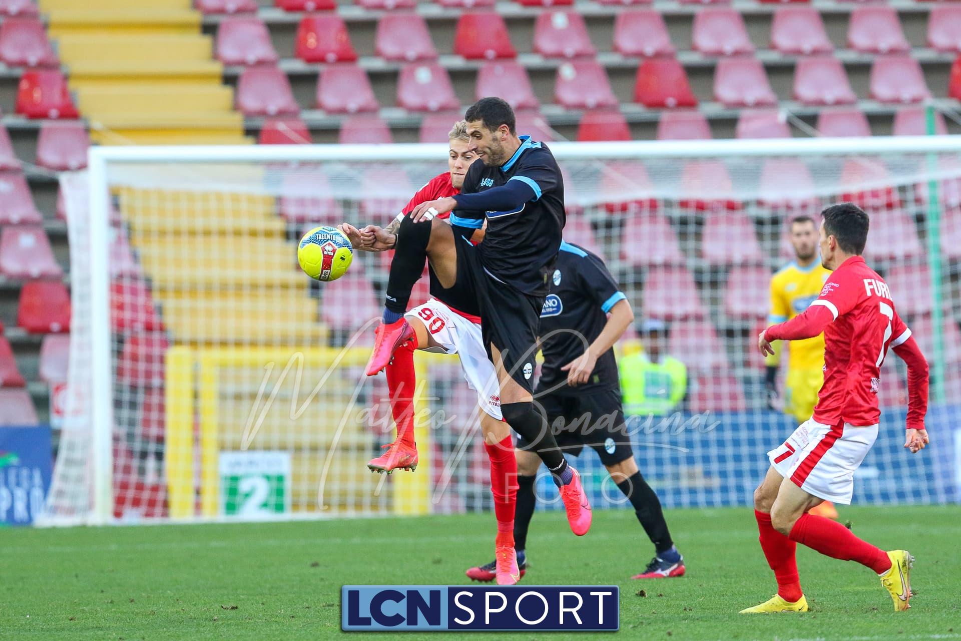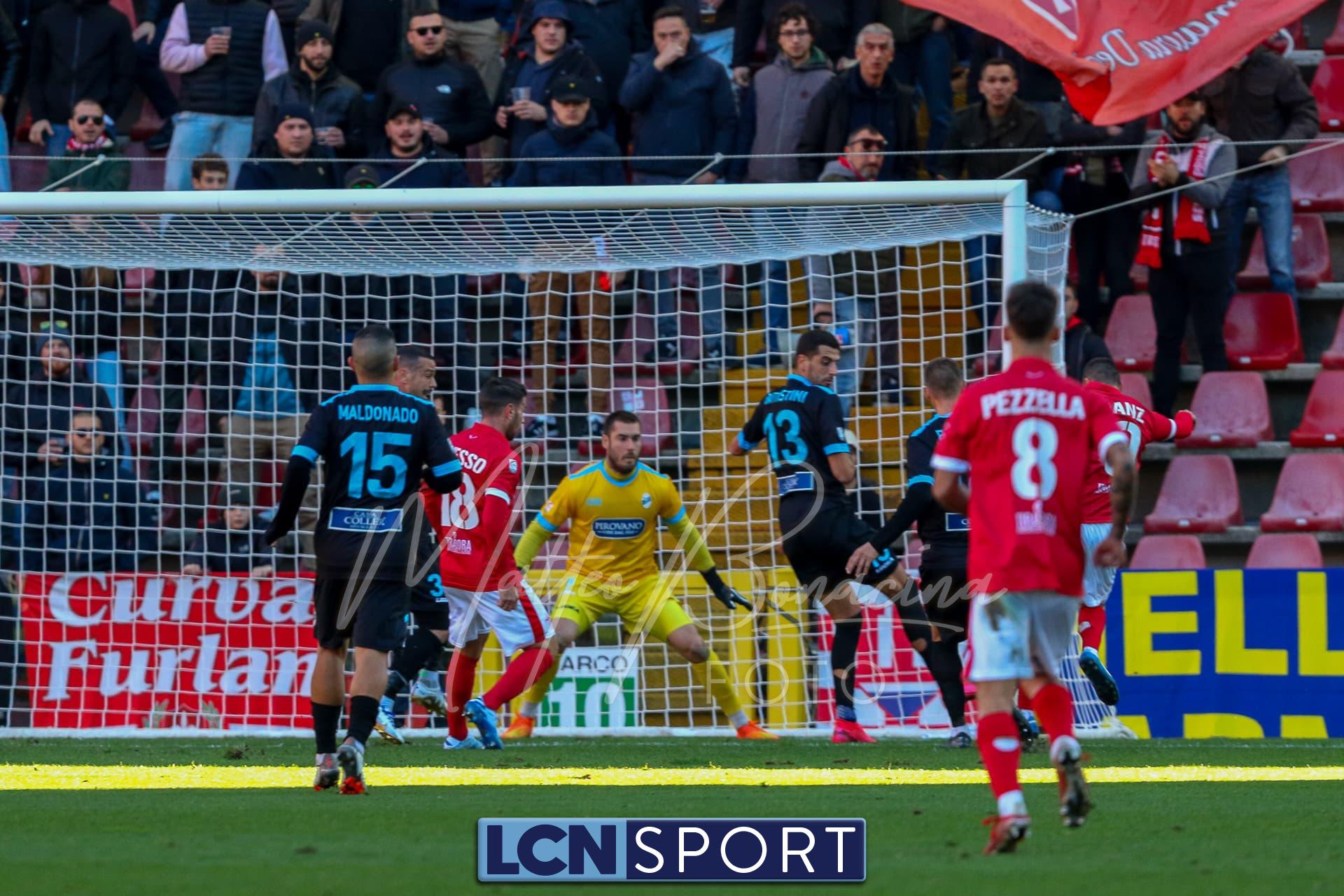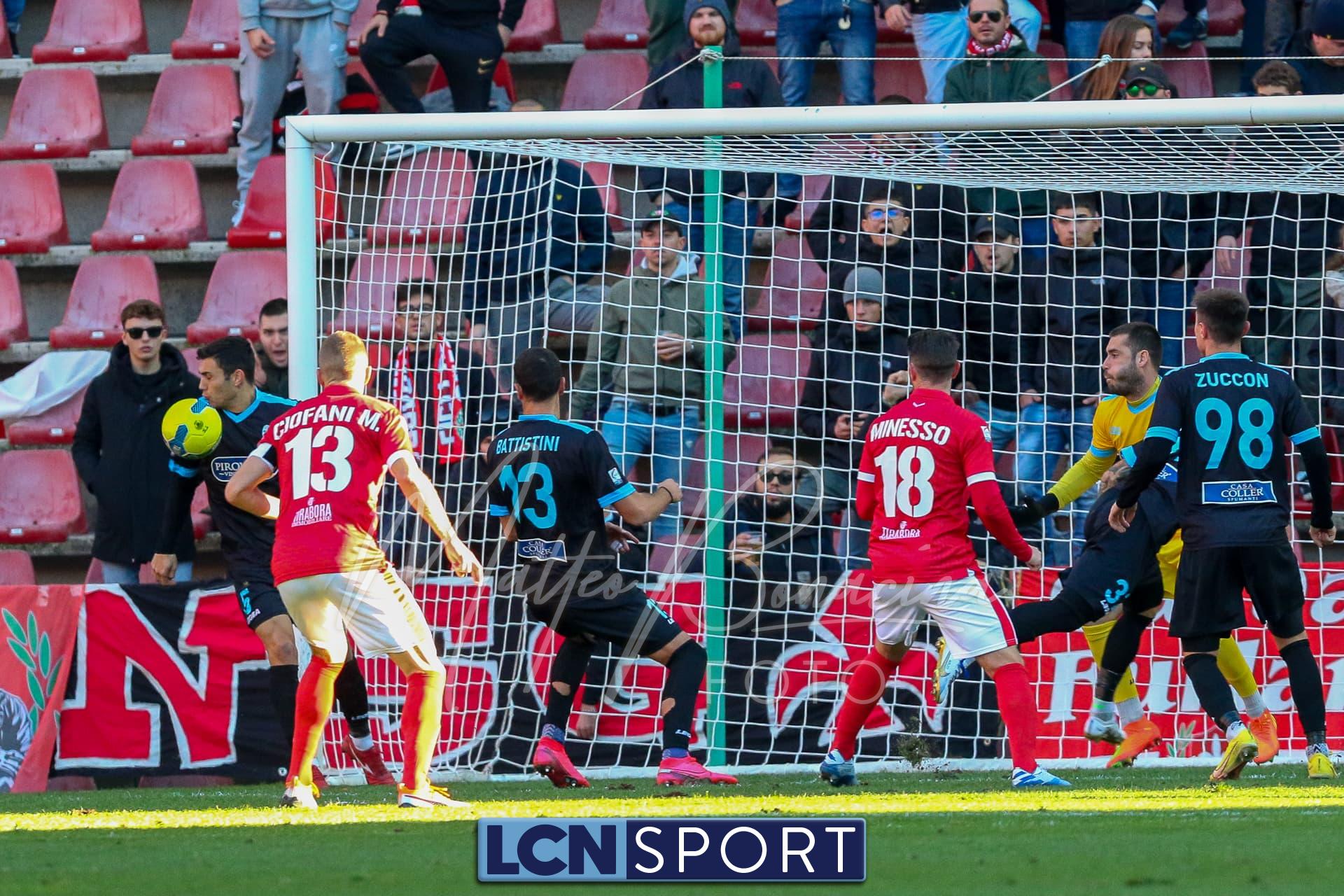 Minuto 17, grande occasione per il Lecco: dal corner di Maldonado Celjak la schiaccia di testa e colpisce un difensore dei padroni di casa sulla linea.