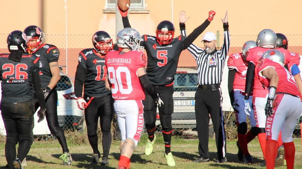 Partita cominciata in difesa per i brianzoli, che fin da subito hanno premuto sull’acceleratore mettendo molta pressione all’attacco mantovano che ha avuto poche manovre di “offesa” nei confronti della difesa nero/rossa. È proprio dalla difesa che arrivano i primi punti della partita, ben 8. Prima grazie a un fumble ricoperto direttamente in endzone da parte di Daniele Bonanomi (+6). Nel drive successivo sempre dalla difesa sono arrivati altri due punti grazie ad una safety (+2) di Matteo Carbonara.