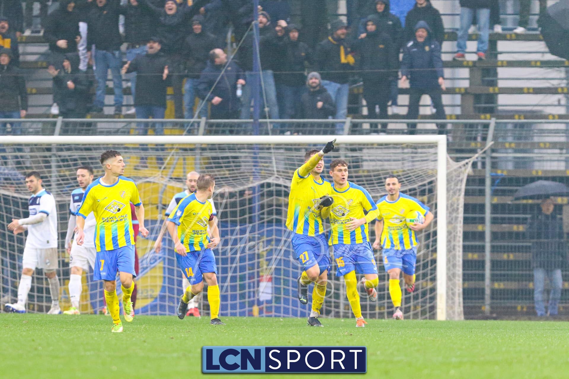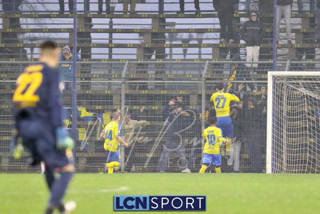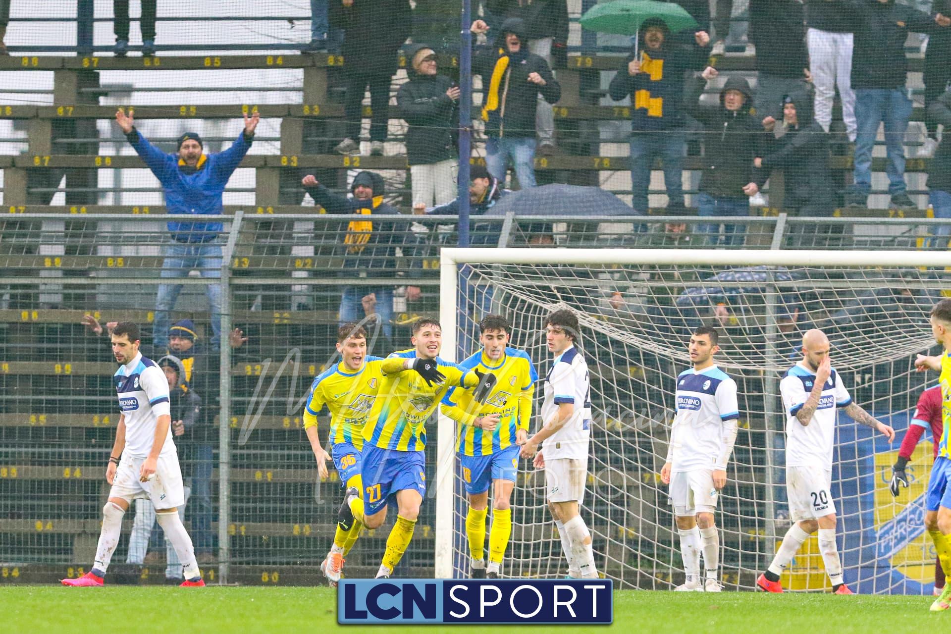 Il Lecco passa subito in vantaggio, bastano 40 secondi: grande cambio gioco di Giudici da destra e Ilari, al limite dell’area sul versante sinistro, realizza una rete straordinaria con un magico sinistro al volo di difficoltà elevata.
