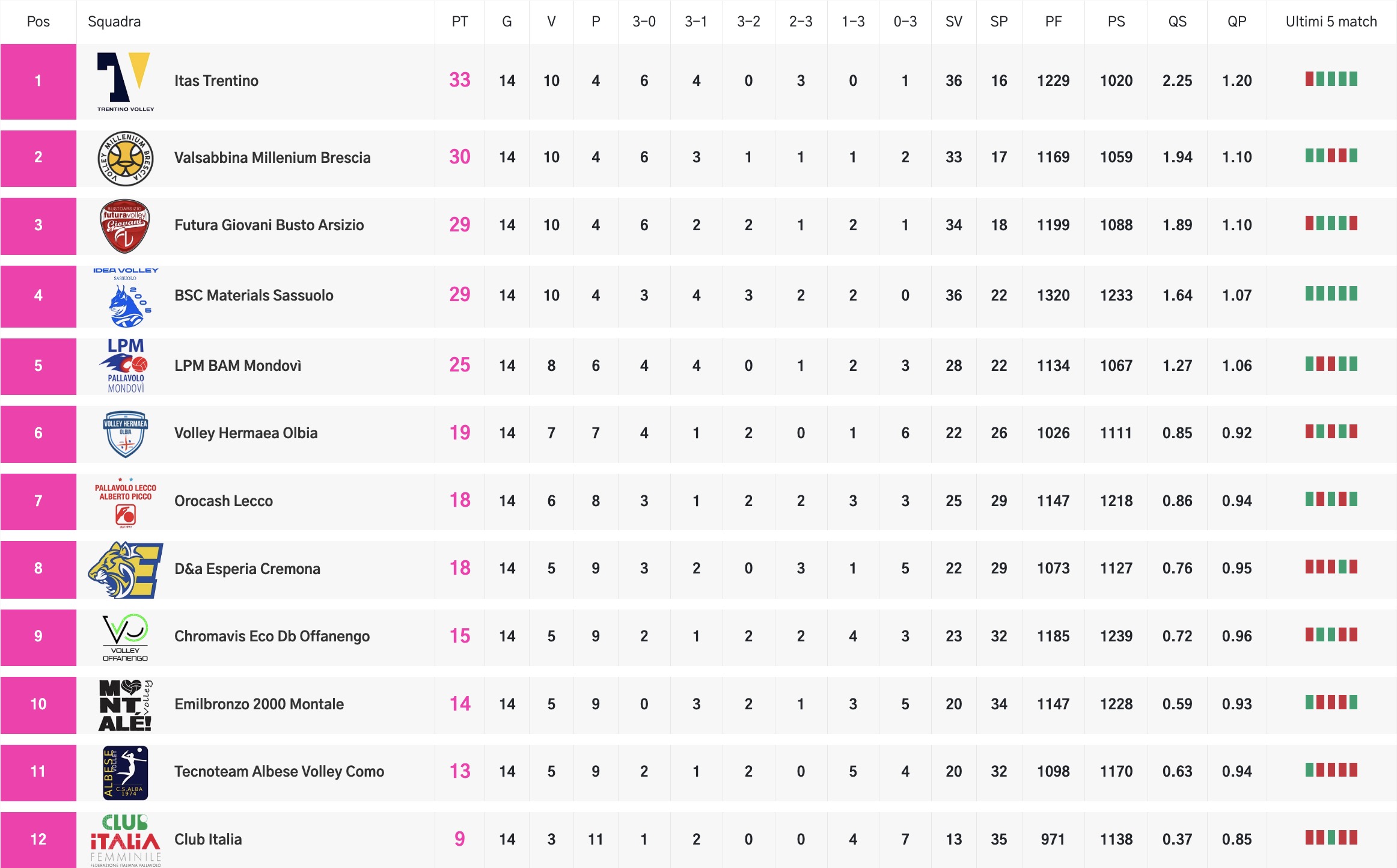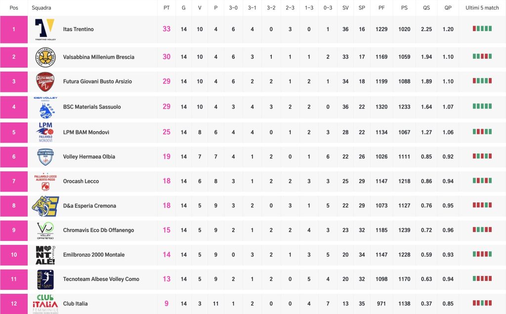 Già dopo la metà del primo set il divario si è fatto ampio (18-12) soprattutto per la grande efficacia delle padroni di casa a muro – 6 in totale nella frazione – e ha permesso alla compagine guidata da coach Gianfranco Milano di andare con scioltezza verso la chiusura del parziale senza dannarsi troppo l’anima (25-17), spingendo forte sulla verve di Martina Bracchi. Il Club Italia ha fatto vedere qualcosa di meglio durante il secondo set, ma anche in questo caso le fiammate delle giovani ospiti sono state contenute fino all’allungo messo a segno nel finale (25-22). Buona uscita dai blocchi della squadra federale durante il terzo set (0-2), cancellata in un amen dal ritorno di fiamma di Zingaro&Co, che contengono la buona fase centrale delle azzurrine e poi mettono la freccia, allungando quanto basta fino all’ace finale di Tresoldi.