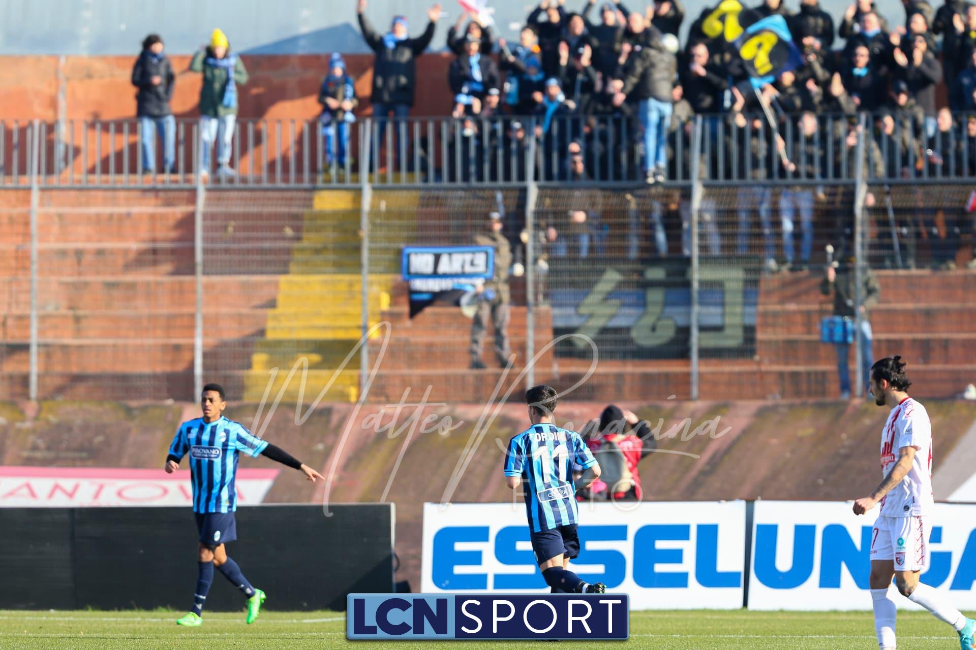 La ripresa si apre con il colpo di testa di Bocalon su cross da sinistra di Agbugui, che non inquadra la porta. Sfuma l’azione d’attacco di Lepore per il Lecco, dal calcio d’angolo i blucelesti prendono un contropiede micidiale con Procaccio lanciato a rete da solo e steso da Melgrati: calcio di di rigore ineccepibile. Sul dischetto va Guccione che spiazza il portiere lecchese.