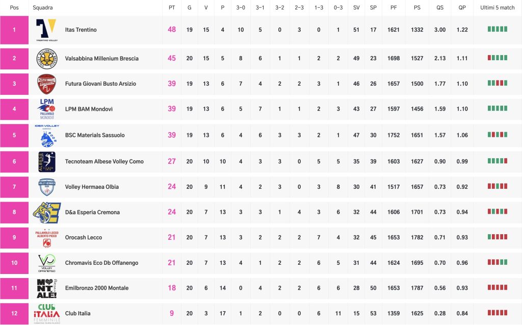 Prosegue il periodo negativo per la Orocash Picco Lecco. Le biancorosse hanno disputato una prova sicuramente positiva sul campo della forte Valsabbina Millenium Brescia, ma alla lunga i valori tecnici della compagine di casa sono venuti fuori e hanno permesso alla vicecapolista di fare bottino pieno: la classifica dice che le Leonesse sono a poca roba dal piazzamento finale dietro la Itas Trentino Volley, prossima avversaria delle lecchesi che vedono la Pool Promozione e la salvezza diretta come una vera e propria chimera. Da tenersi addosso, ripetiamo, la reazione avuta dopo la scoppola rimediata 48 ore prima tra le mura amiche con Offanengo: l’inizio del recupero dalla quarta giornata di ritorno è molto equilibrato, con un’ottima Orocash che tiene botta fino alla seconda metà, poi Brescia se ne va (18-13) e mette a segno lo strappo non più ricucito (25-21).