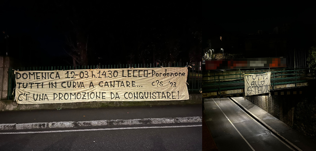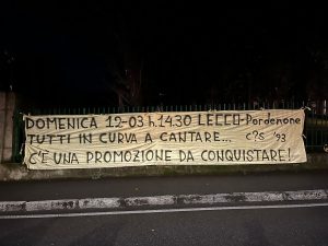 Lecco-Pordenone è in rapido avvicinamento. Aria di grande appuntamento all’ombra del Resegone, dove domenica pomeriggio alle 14.30 si scenderà in campo ed entrambe le compagini avranno la voglia di fare bottino pieno per continuare l’inseguimento alla Serie B. Per quanto riguarda il tifo ospite non è previsto un esodo dal Friuli, ma l’arrivo di un ristretto nucleo di supporter neroverdi meglio noti come “Bandoleros”; diversa la questione per l’area bluceleste: soprattutto in Curva Nord si è visto un bel colpo d’occhio durante questi ultimi mesi e l’idea è quella di riuscire a proseguire su questa strada. Nella notte tra martedì 7 e mercoledì 8 marzo sono comparsi degli striscioni in città: «Domenica 12-03, h.14.30 LECCO Pordenone. Tutti in Curva a cantare… C’è una promozione da conquistare!», firmato dallo storico gruppo ultras Cani?Sciolti, che tra l’altro festeggeranno a brevissimo il trentesimo anno di vita e attività. I biglietti sono in vendita dalla mattinata di martedì e il portale mostra già un buon numero di tagliandi venduti.