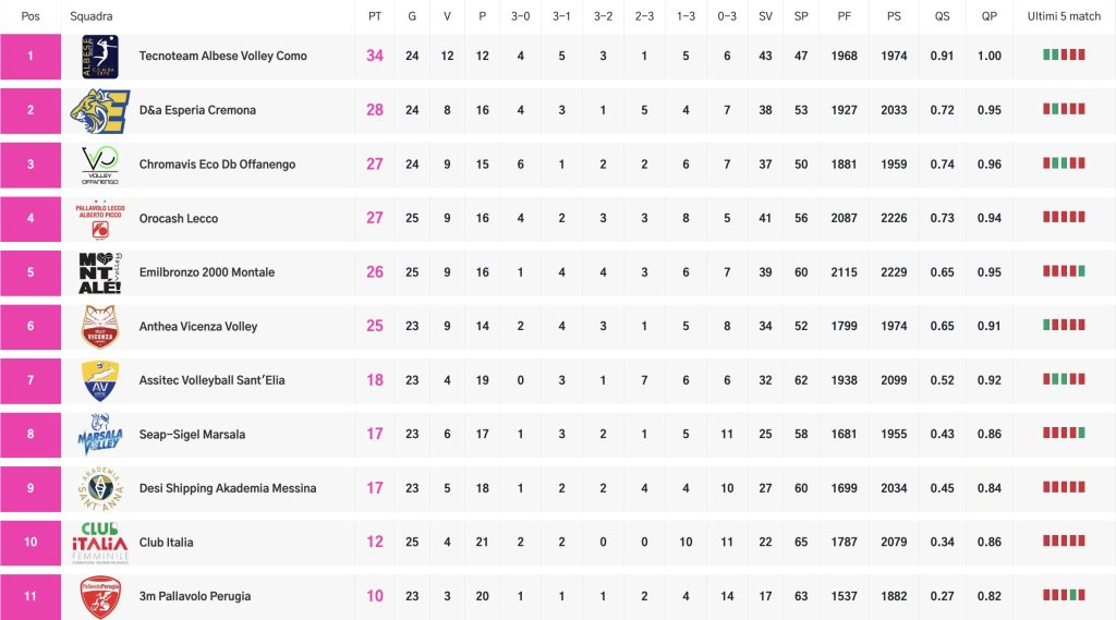Tornando alle questioni biancorosse, a Sant’Elia la Picco Lecco approccia bene la questione, tanto quanto le padrone di casa: al giro di boa del primo set le due compagini sono incollate, ma un’accelerata della Orocash vale il primo punto della serata. Il secondo set vede le ospiti allungare sin dall’alba (5-9), le laziali accorciano e sorpassano ma non scappano, quindi le lecchesi salutano e si portano sul doppio vantaggio (20-25). La Assitec riparte forte e domina il terzo set, che ha visto coach Milano operare delle ampie rotazioni per conservare le energie in vista della quarta frazione: il discorso procede in equilibrio fino alle battute finali (18-18), tanto che si va ai vantaggi e sono le padrone di casa a spuntarla (28-26). L’equilibrio non esiste nella quinta frazione, con la Picco Lecco che saluta subito e diventa irraggiungibile (3-11): finisce con un vantaggio più che doppio (7-15). Mvp di serata Martina Bracchi con i suoi 34 punti.