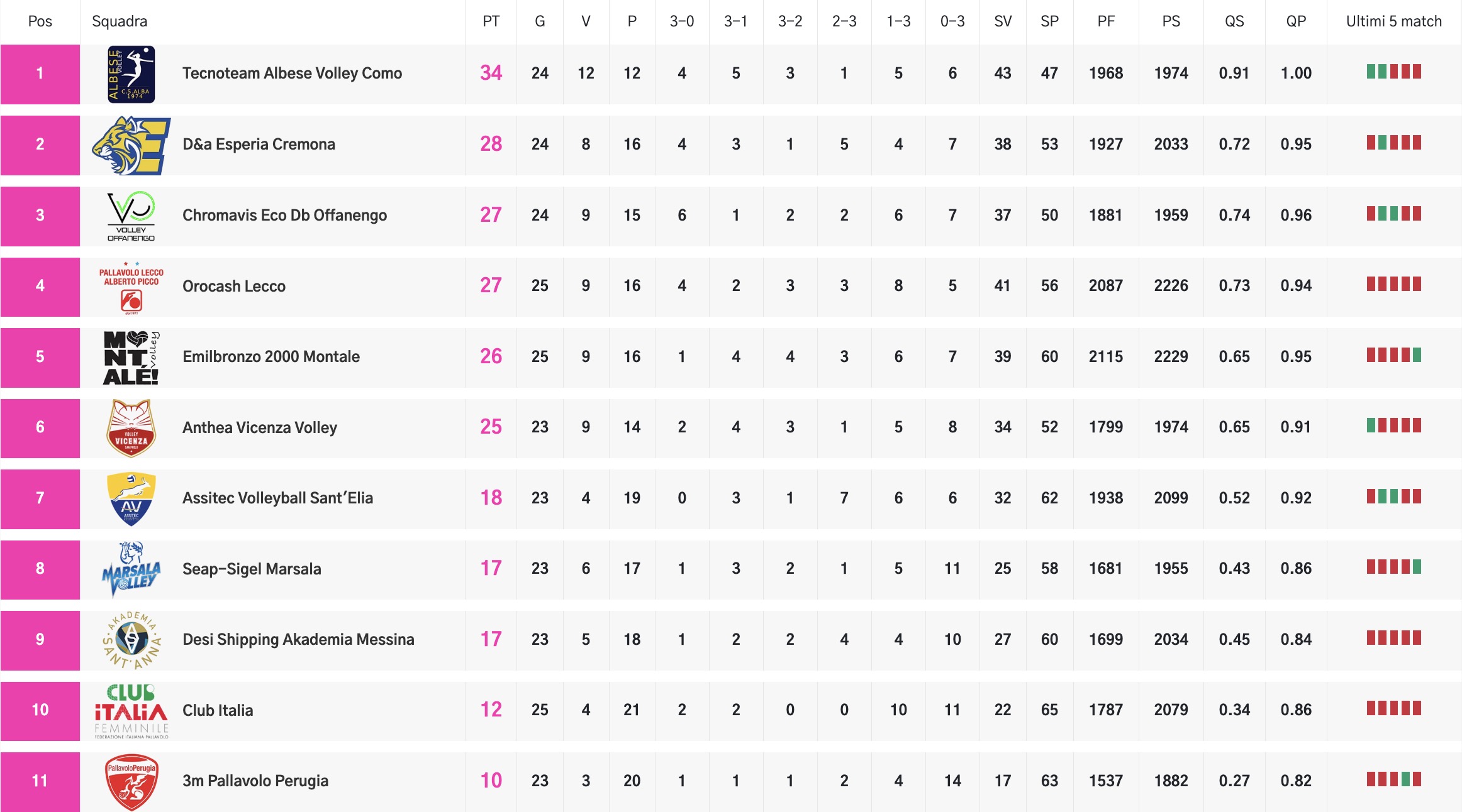 Lecco: Rimoldi 1, Bracchi 34, Lancini 14, Tresoldi 14, Piacentini 12, Zingaro 6, Bonvicini (L), Bassi 4, Belloni 1, Rocca. Ne: Albano, Marmen, Citterio, Casari (L). All. Milano.