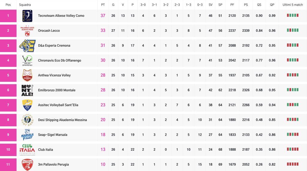 C’è gara giusto per un tempo: la Orocash Picco Lecco asfalta la 3M Pallavolo Perugia e guadagna terreno sulla quinta in classifica in Pool Salvezza. Qualunque cosa succederà durante il turno di riposo pasquale, che vedrà tutte le altre scendere in campo, le biancorosse riprenderanno con questa avventura nella zona che vale la permanenza in Serie A2. Partono comunque meglio le padrone di casa (7-4), ma è un fuoco di paglia che si esaurisce al giro di boa (13-11): messe da parte le fatiche, le lecchesi cambiano marcia e si portano a casa il primo set (22-25). Un trend che nel secondo set si fa più chiaro: Bracchi&Co fanno il bello e il cattivo tempo, chiudono agilmente (15-25), creano i presupposti anche nel terzo set (14-21) prima del sussulto finale della 3M spinta dall’ex Lucija Giudici in battuta che, però, non basta a cancellare un finale ormai scritto. Si tornerà in campo il 16 aprile con la Desi Shipping Akademia Messina