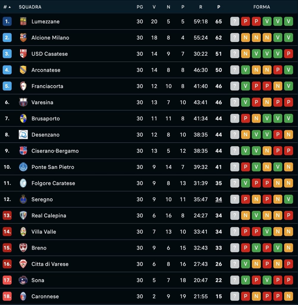 Casatese: Merelli; Scipione, Comberiati, Romano, Pirola, Videkon, Sassella (34’st Gulinelli), Pontiggia, Personè (13’st Quaggio), Isella, Costanzo (19’st Stefanoni). A disposizione: Picarelli, Perego, Polenghi, Ballabio, Saracino, Parravicini. All. Giuseppe Commisso.