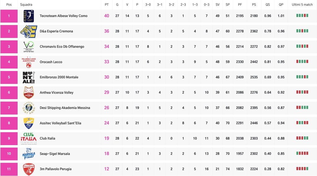 C’era fiducia prima di Desi Shipping Akademia Messina–Orocash Picco Lecco, gara giocata con la testa anche a Julia Ituma. Fiducia che non si è tramutata in punti al termine della trasferta siciliana: le biancorosse sono ripartite domenica sera alla volta della Lombardia senza niente in tasca, se non parecchia amarezza. 3-1 per la compagine meridionale, obbligata a vincere per continuare a nutrire speranze in chiave salvezza. Più brave le padrone di casa a portare a casa due dei tre set giocati sul fil di lana, soprattutto a difendere meglio sul 24-23 nel corso della quarta frazione. Acquista, quindi, un peso specifico notevole la partita in programma al Bione alle 17 di domenica 23 aprile contro Anthea Vicenza Volley, oggi prima compagine in zona retrocessione, prima di due gare interne nel giro di pochi giorni.