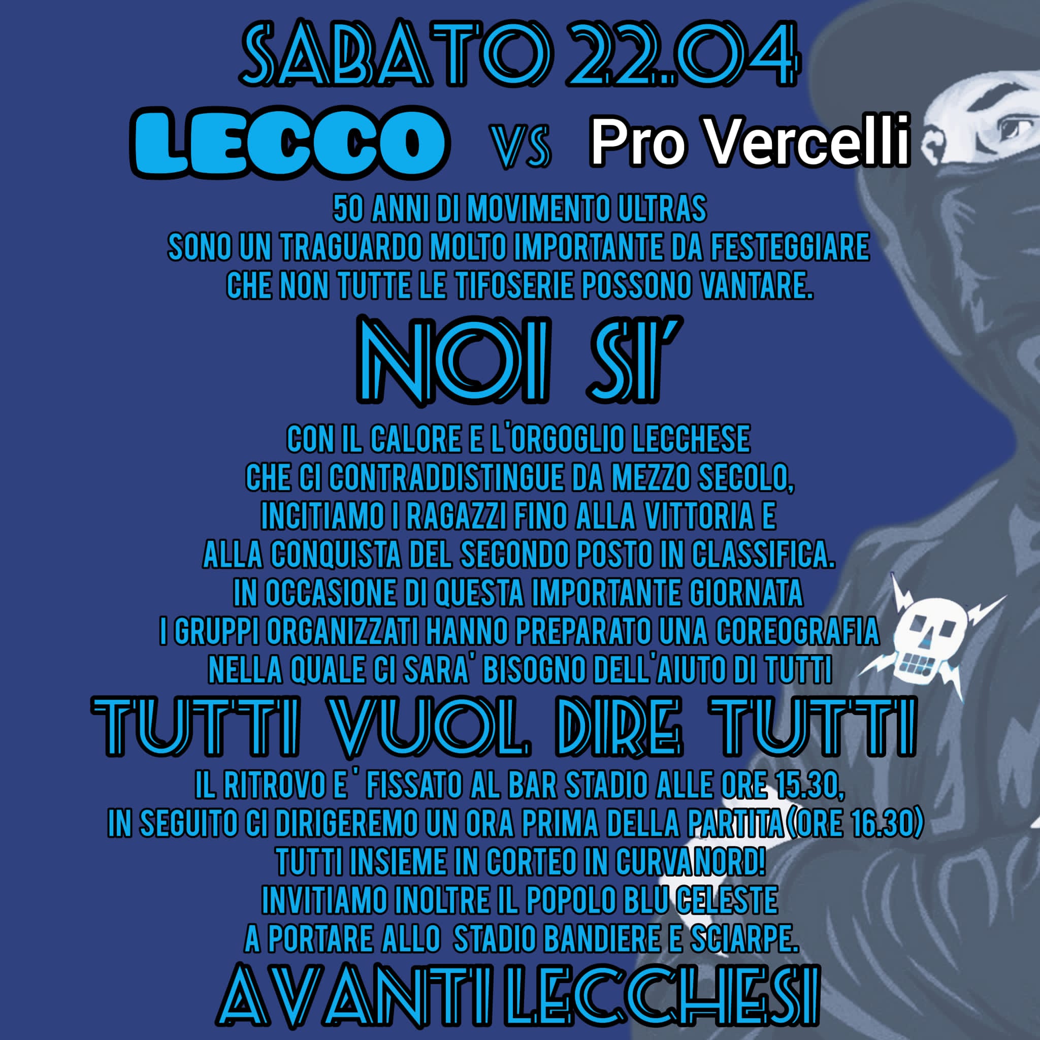 Non solo calcio giocato. Lecco-Pro Vercelli rappresenterà un giorno importante anche per il movimento ultras lecchese. Prima della partita, infatti, sarà mostrata la coreografia organizzata dai gruppi della Curva Nord in occasione del 50° anniversario dalla nascita dello stesso movimento, un traguardo importante per una piazza conosciuta da sempre per il suo calore. Giovedì 20 aprile il Bar Stadio di Lecco ha ospitato la presentazione del libro “Da qui ci siamo passati tutti” che ripercorre la storia del tifo lecchese, raccontata attraverso testimonianze e foto più o meno recenti.