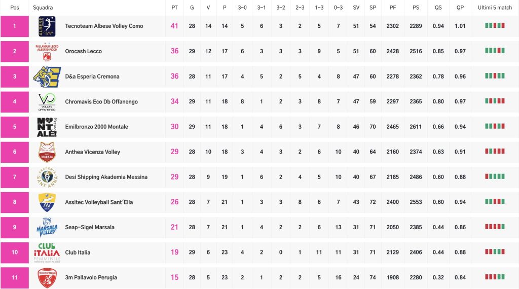 Tre partite alla fine della Pool Salvezza per la Orocash Picco Lecco. Dopo aver superato in modo brillante l’ostacolo Anthea Vicenza, le biancorosse sono chiamate alla replica con l’Assitec Volleyball Sant’Elia che sarà ricevuta alle 17 di mercoledì 26 aprile al Bione. Un impegno di fondamentale importanza per le lecchesi e le frusinati: altri tre punti potrebbero regalare la salvezza visto l’incrocio tra Montale, la stessa Vicenza e Cremona–Messina in programma alle 20.30, ma anche le Gazzelle sono tornate in corsa grazie al recente successo con la Tecnoteam Albese Volley. La settimana biancorossa si chiuderà con il match di Marsala, prima dell’epilogo con la già retrocessa 3M Pallavolo Perugia del 7 maggio e della giornata di riposo all’ultimo turno: la strada per la mantenimento della categoria sta spianando e siamo al momento del dunque.