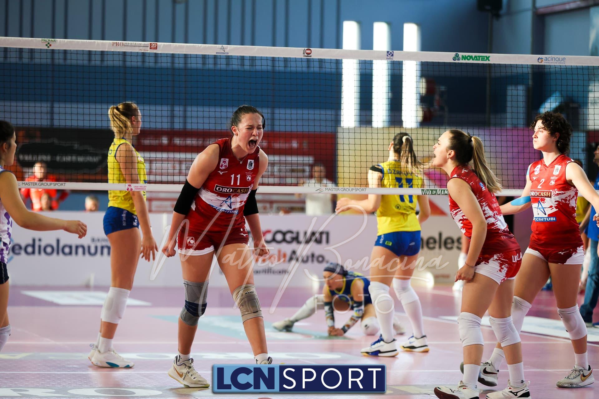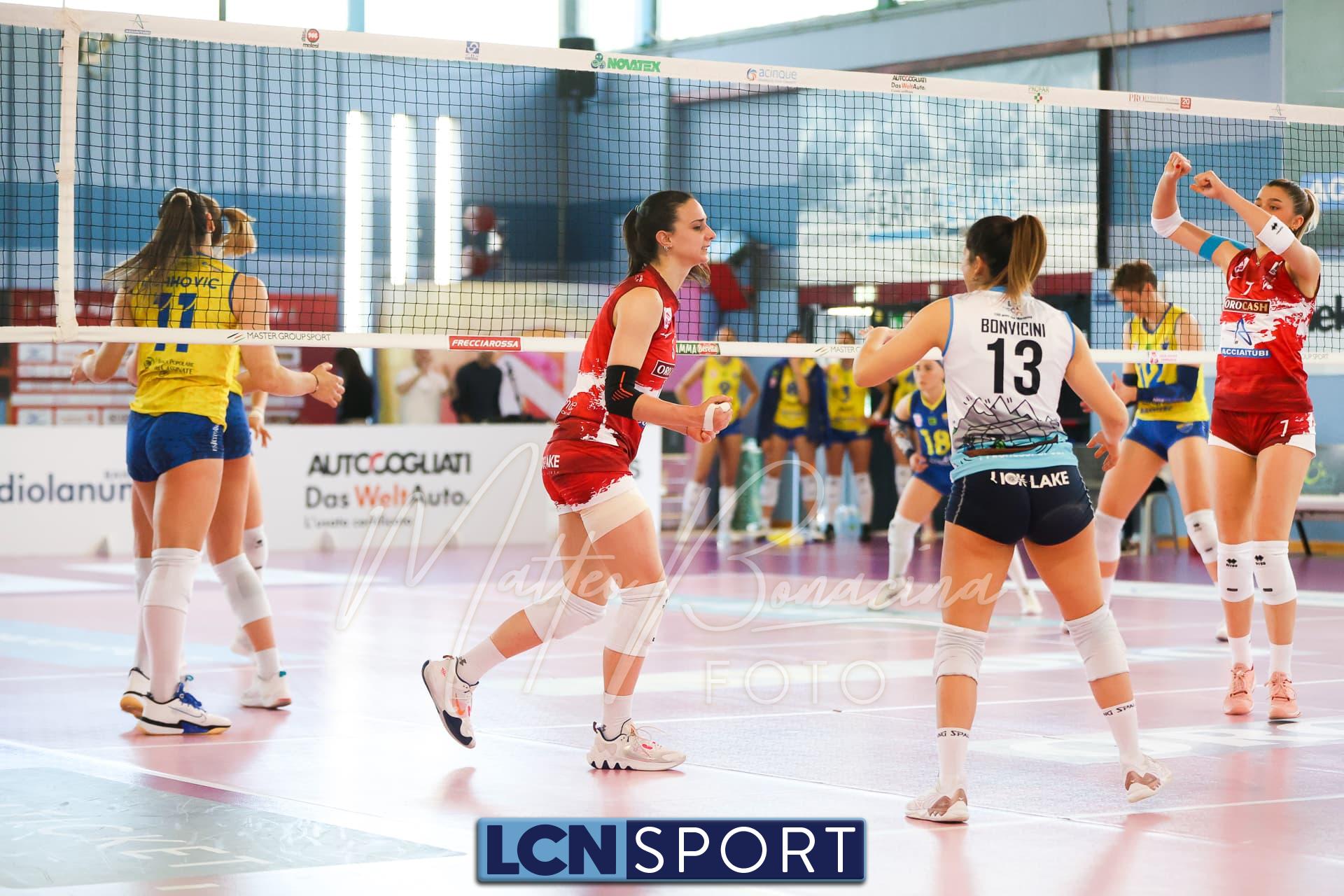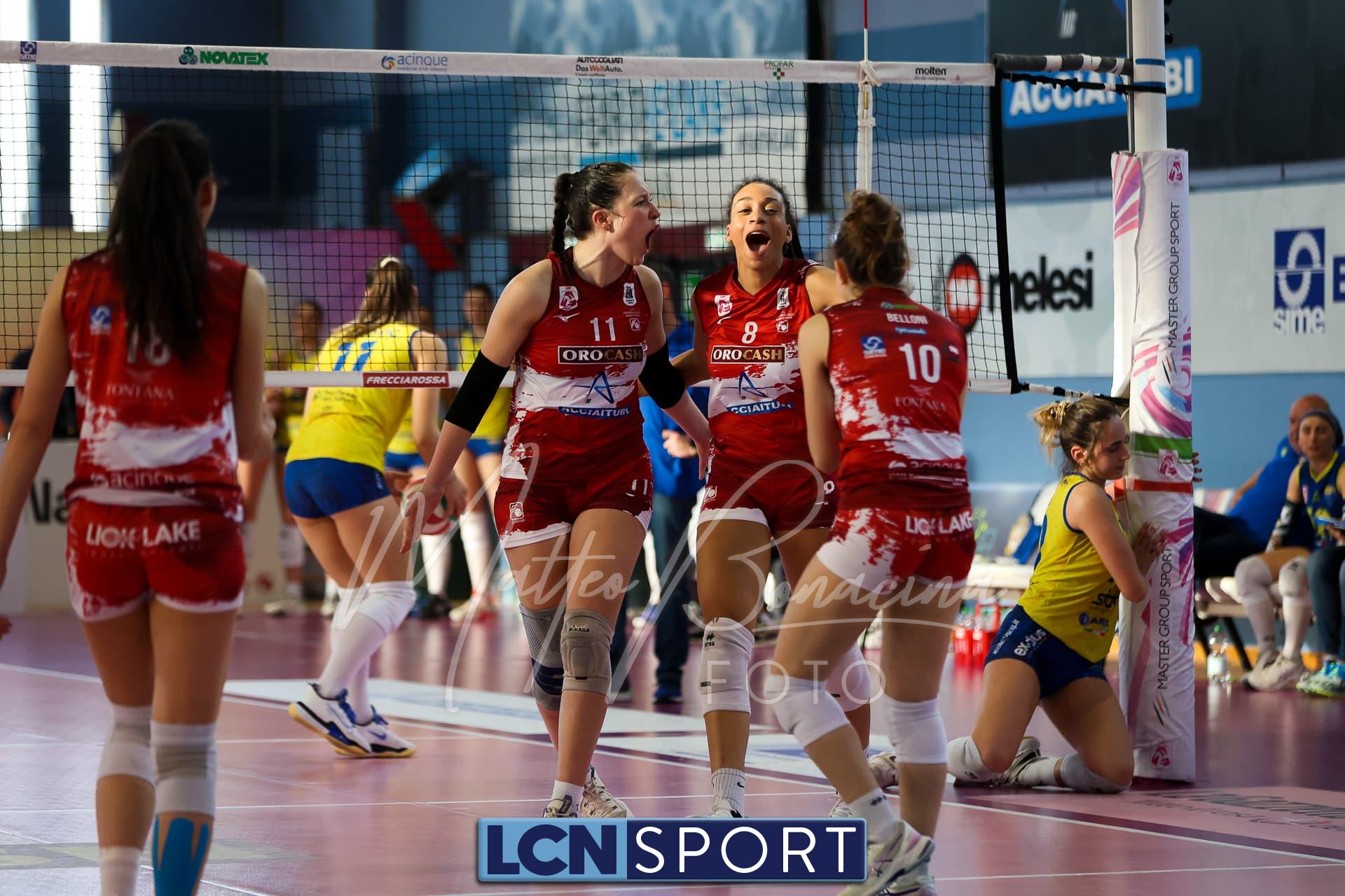 Per quanto riguarda il match del “Bione”, a lungo è sembrato non esserci proprio partita: le biancorosse hanno condotto il primo set (22-17) e pure il secondo (25-20) grazie a un’efficacia migliore nei fondamentali. Quando, nel terzo set, è Sant’Elia a passare al comando ecco che la Picco Lecco non riesce mai a mettere l’ultimo punto per ricucire lo strappo per mancanza di lucidità: si arriva a un’incollatura, ma le frusinati si mantengono vive gestendo con sangue freddo. Ciò che non serve nel quarto parziale: la Orocash accusa un blackout, al punto che coach Gianfranco Milano preferisce stravolgere il sestetto a metà set per far rifiatare le giocatrici rimaste in campo per più tempo nelle due gare disputate in tre giorni. La contesa vera riprende al tie break: Sant’Elia sogna il colpo grosso (2-5), la Picco Lecco esce fortissimo dal time out, piazza uno punto e due muri che in due minuti rimettono tutto in discussione. Tresoldi è in trance agonistica, le frusinati spariscono dal campo e l’ultimo punto in palio rimane in casa biancorossa.
