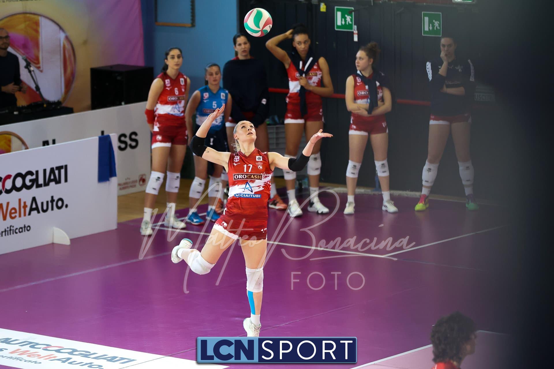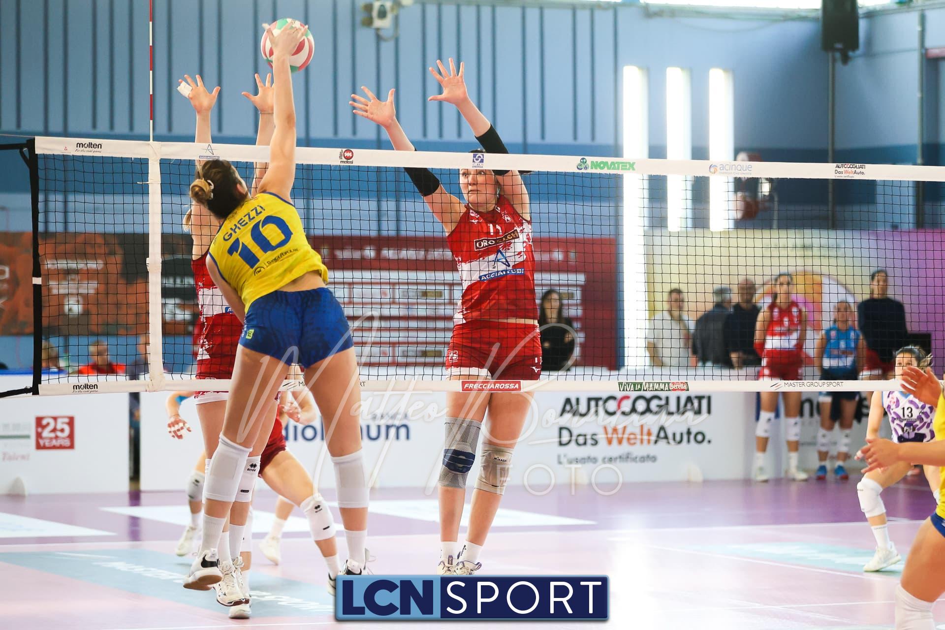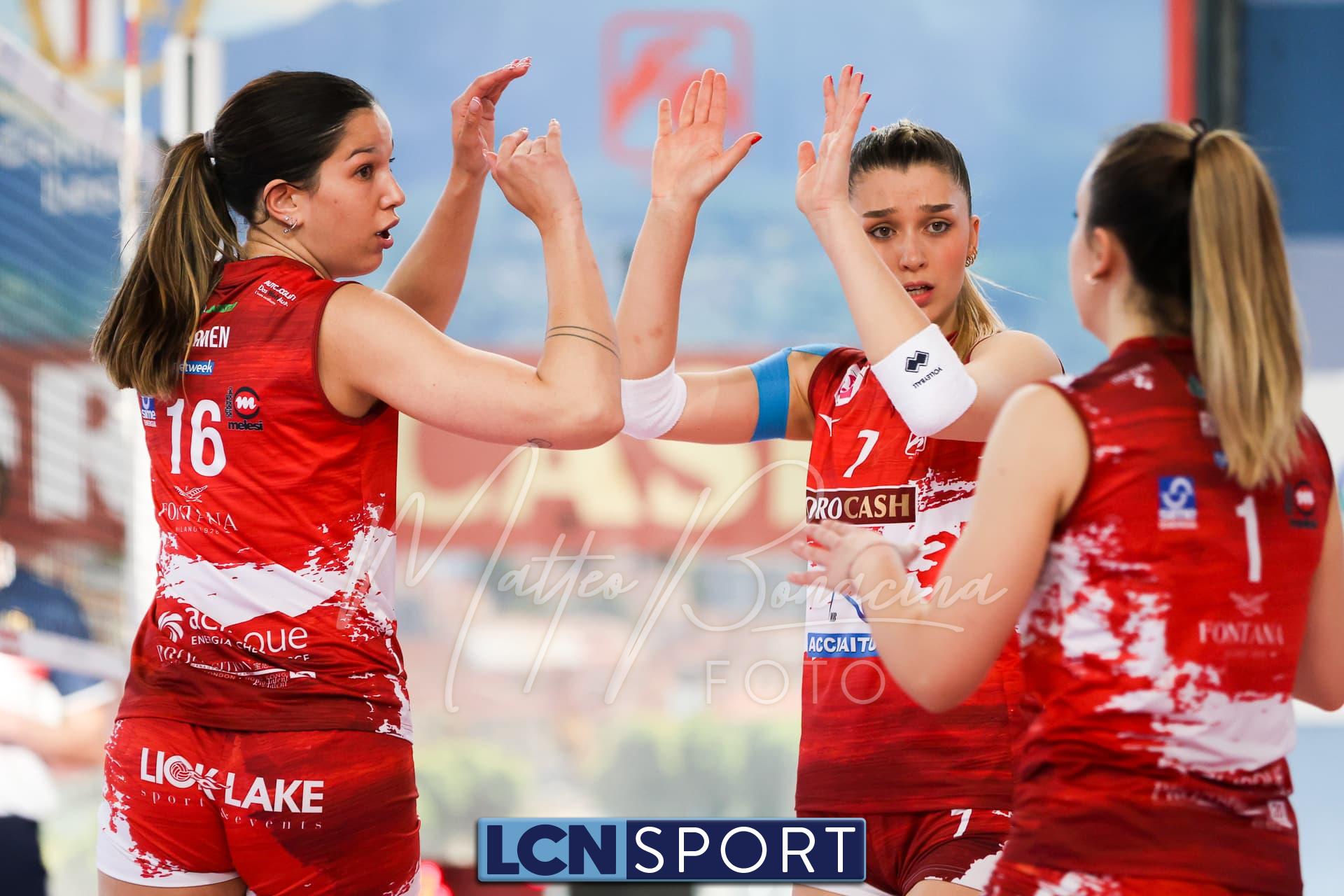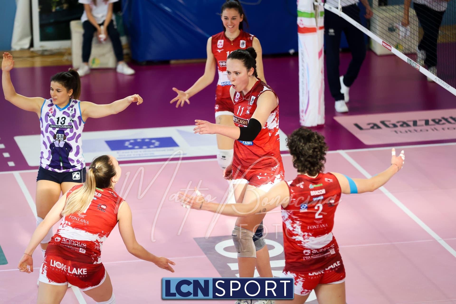Per quanto riguarda il match del “Bione”, a lungo è sembrato non esserci proprio partita: le biancorosse hanno condotto il primo set (22-17) e pure il secondo (25-20) grazie a un’efficacia migliore nei fondamentali. Quando, nel terzo set, è Sant’Elia a passare al comando ecco che la Picco Lecco non riesce mai a mettere l’ultimo punto per ricucire lo strappo per mancanza di lucidità: si arriva a un’incollatura, ma le frusinati si mantengono vive gestendo con sangue freddo. Ciò che non serve nel quarto parziale: la Orocash accusa un blackout, al punto che coach Gianfranco Milano preferisce stravolgere il sestetto a metà set per far rifiatare le giocatrici rimaste in campo per più tempo nelle due gare disputate in tre giorni. La contesa vera riprende al tie break: Sant’Elia sogna il colpo grosso (2-5), la Picco Lecco esce fortissimo dal time out, piazza uno punto e due muri che in due minuti rimettono tutto in discussione. Tresoldi è in trance agonistica, le frusinati spariscono dal campo e l’ultimo punto in palio rimane in casa biancorossa.