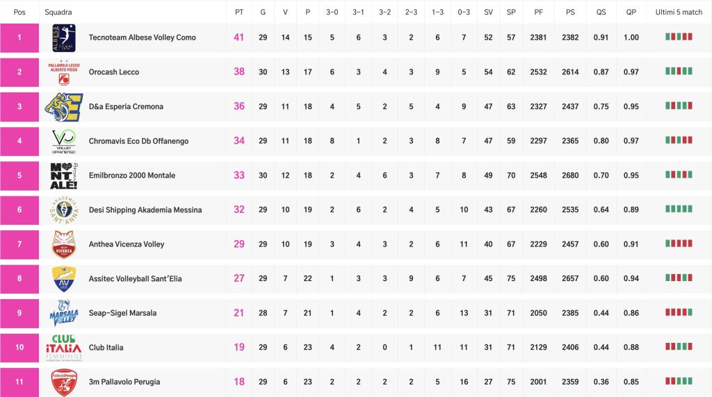 Manca poco: la Orocash Picco Lecco, la squadra «già retrocessa», è a poca distanza dalla conquista della salvezza in Serie A2. Un traguardo che potrebbe essere tagliato tra pochi giorni a Marsala e che, forse questo è il piccolo rammarico, avrebbe potuto essere avvicinato ancor di più mercoledì: vuoi il calo improvviso nel terzo set e vuoi un’Assitec Sant’Elia che è specializzata nel tirare le partite fino al tie break, il bottino si è ridotto a due – comunque preziosissimi – punti. Le giostre hanno lasciato da poco l’esterno del centro sportivo, ma dentro al palazzetto si è vissuto un pomeriggio sulle montagne russe. Diciamo anche che, classifica alla mano, le biancorosse vantano un percorso migliore rispetto a Emilbronzo Montale (12), Desi Shipping Akademia Messina (10) e Anthea Vicenza (10) parlando di partite vinte (13), un jolly di un certo peso quando siamo a sole tre partite dalla fine della Pool Salvezza. E se proprio proprio dobbiamo dirla tutta, anche il quoziente set è nettamente migliore rispetto a quello delle tre contendenti: parlando termini ciclistici siamo all’ultimo chilometro e il vantaggio su chi sta dietro c’è tutto, tra la trasferta in Sicilia o l’epilogo interno con la 3M Perugia servirà l’ultimo sforzo per il gioco-partita-incontro. Ma senza badare alla matematica, nemica vera di chi può permettersi di pensare solo al proprio orticello.