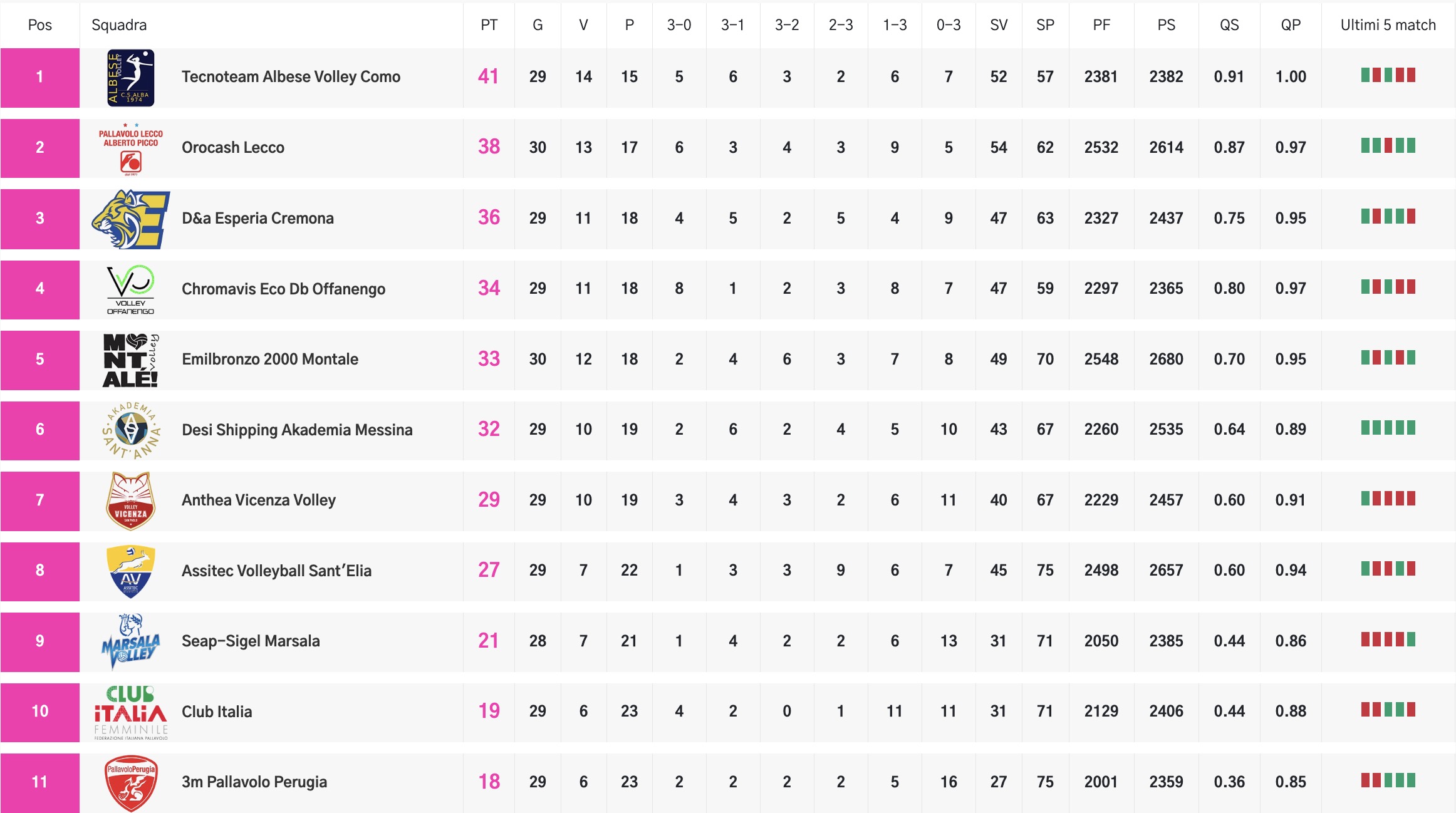 Lecco: Rimoldi 2, Bracchi 28, Lancini 15, Tresoldi 9, Piacentini 10, Zingaro 12, Bonvicini (L), Albano, Bassi 3, Belloni, Marmen 1, Rocca. Ne: Citterio, Casari (L). All. Gianfranco Milano.
