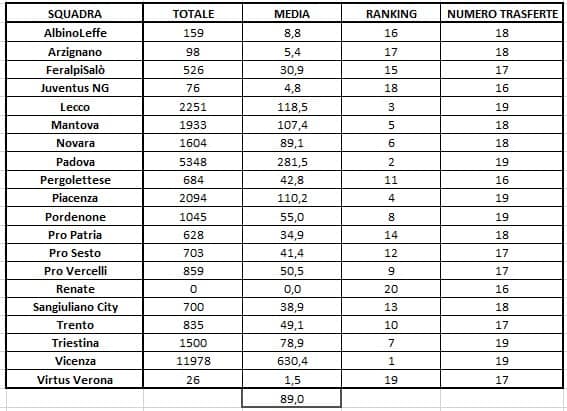 2.251 accessi agli altri 19 stadi del girone A di Serie C, 118.5 di media per ogni partita disputata. Sono i dati che raccontano analiticamente l’importanza del tifo al seguito della Calcio Lecco 1912. Nonostante un rendimento non eccezionale – 14° posto con 21 punti – anche lontano dal “Rigamonti-Ceppi” i blucelesti non sono mai stati soli: la punta è rappresentata dai 238 della vicina Sesto San Giovanni, ma in svariate circostanze si è toccata la tripla cifra. Dati riportati da Stadia Postcards, che si conferma essere una fonte preziosissima.
