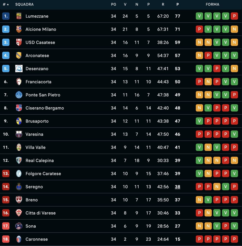 La Casatese conferma il risultato di un anno fa e chiude al terzo posto in Serie D. I biancorossi guidati da mister Joey Commisso hanno pareggiato la seconda gara consecutiva, allungando comunque una striscia positiva aperta varie partite fa. Un buon momento che permetterà di debuttare ai play off a Casatenovo contro l’Arconatese quarta: gara unica e due risultati su tre a disposizione per la compagine lecchese, che eventualmente andrà poi a incrociare la migliore tra Desenzano e Alcione. I milanesi hanno visto il Lumezzane vincere a Varese (0-2) e conquistare la promozione in Serie C dopo anni complessi, ma hanno comunque confermato le premesse d’inizio stagione.