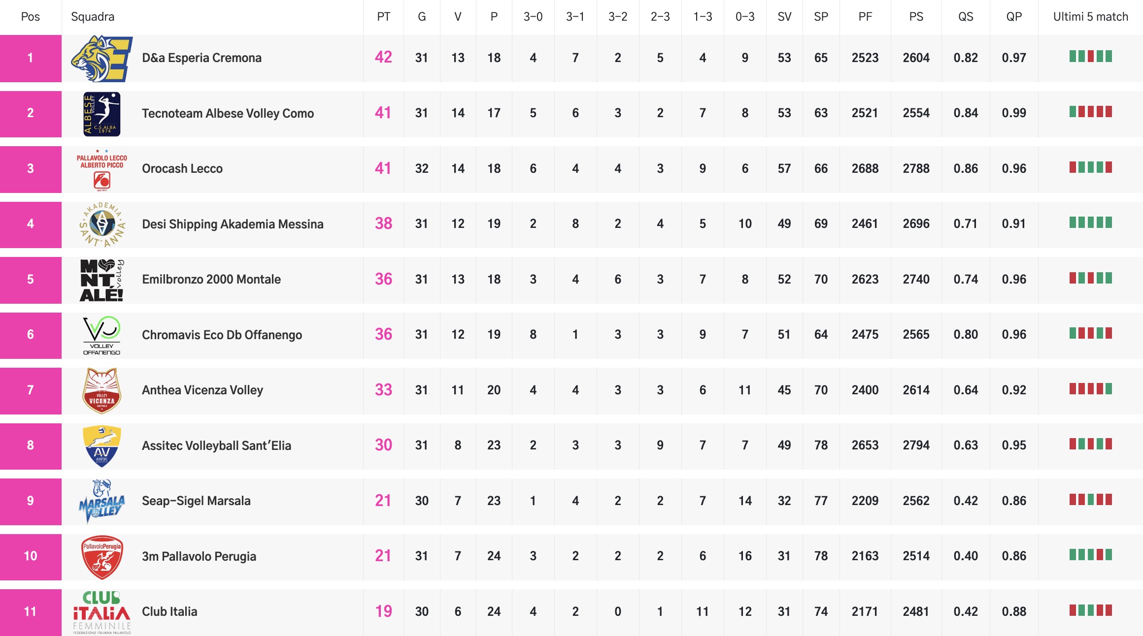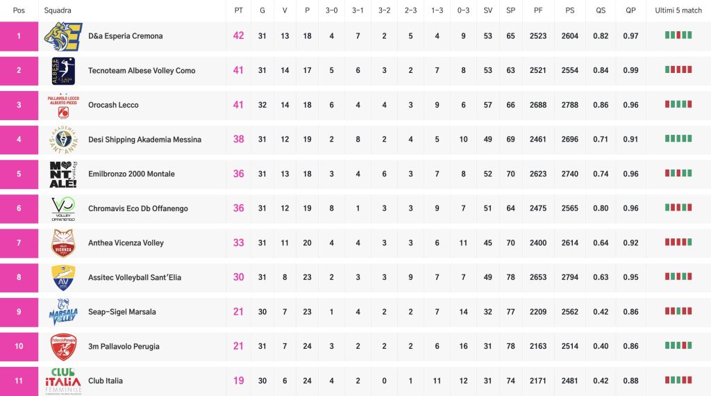 La partita. Primo set molto equilibrato con Perugia – con l’ex “Fralla” Dalla Rosa in panchina per tutto il tempo insieme a Giudici – che tenta subito la fuga (13-16) e a metà set riesce a incrementare il vantaggio (14-19) grazie a un’efficienza nettamente migliore in battuta. Alcuni errori di troppo della Picco Lecco costringono a rincorrere in chiusura di parziale (19-23), con le ospiti che conquistano meritatamente il primo set (20-25). Nel secondo e nel terzo set il canovaccio è un copia-incolla: Perugia scappa subito, le lecchesi inseguono a gran distanza per praticamente tutto il tempo; le umbre si tolgono così di dosso la maglia nera della Serie A2. La notizia, quindi, è il debutto della giovane Carola Casari, premiata anche come Mvp a fine gara.