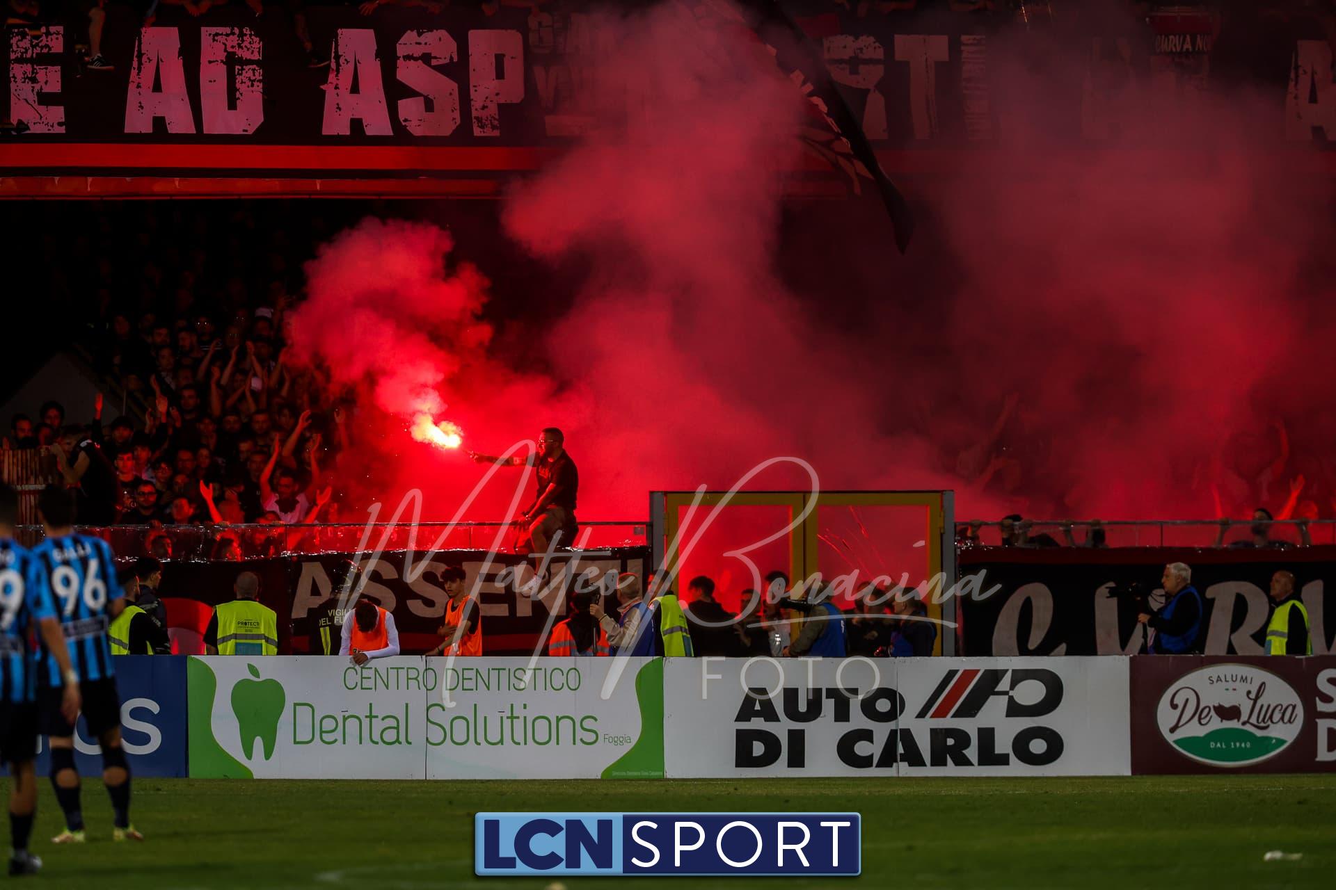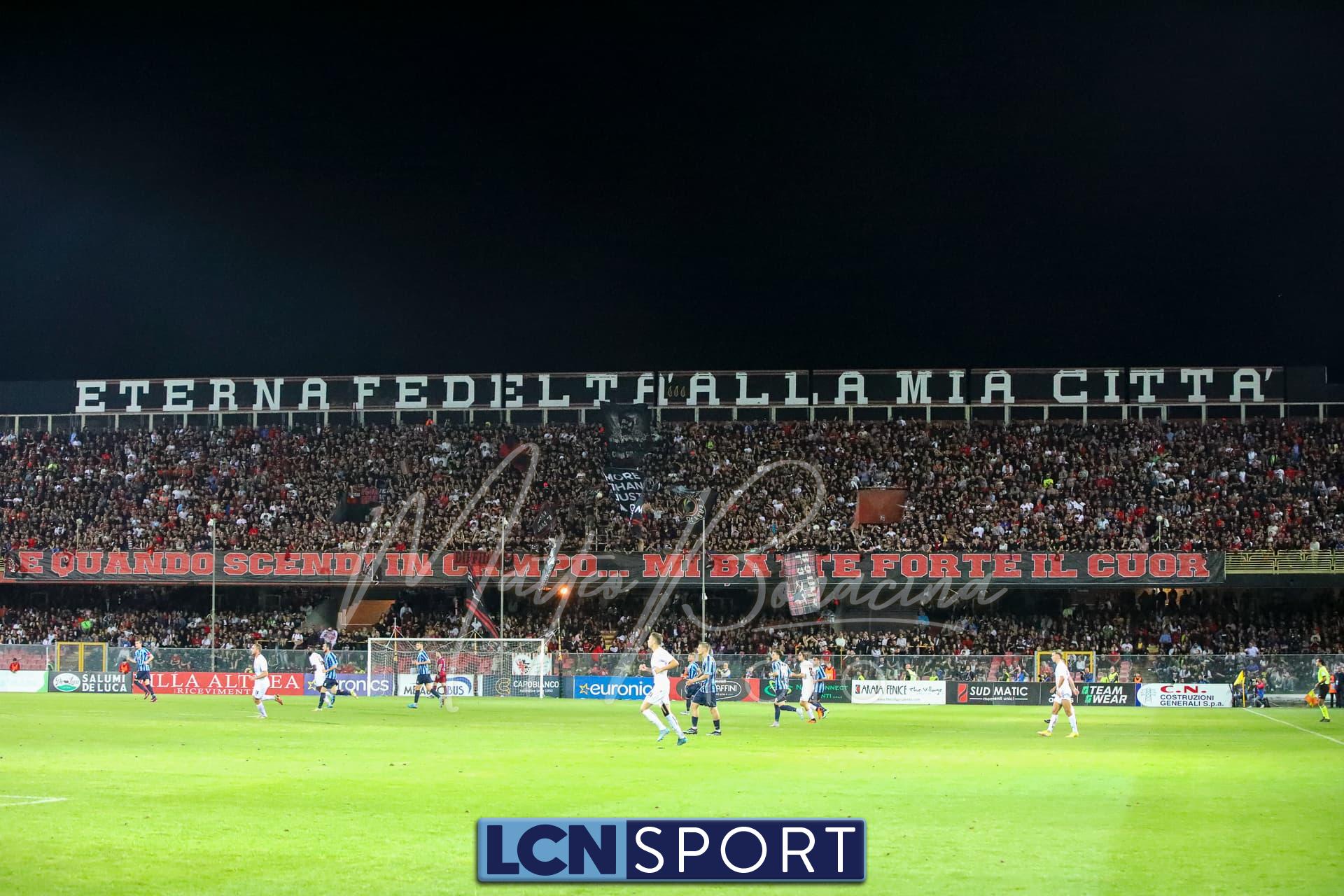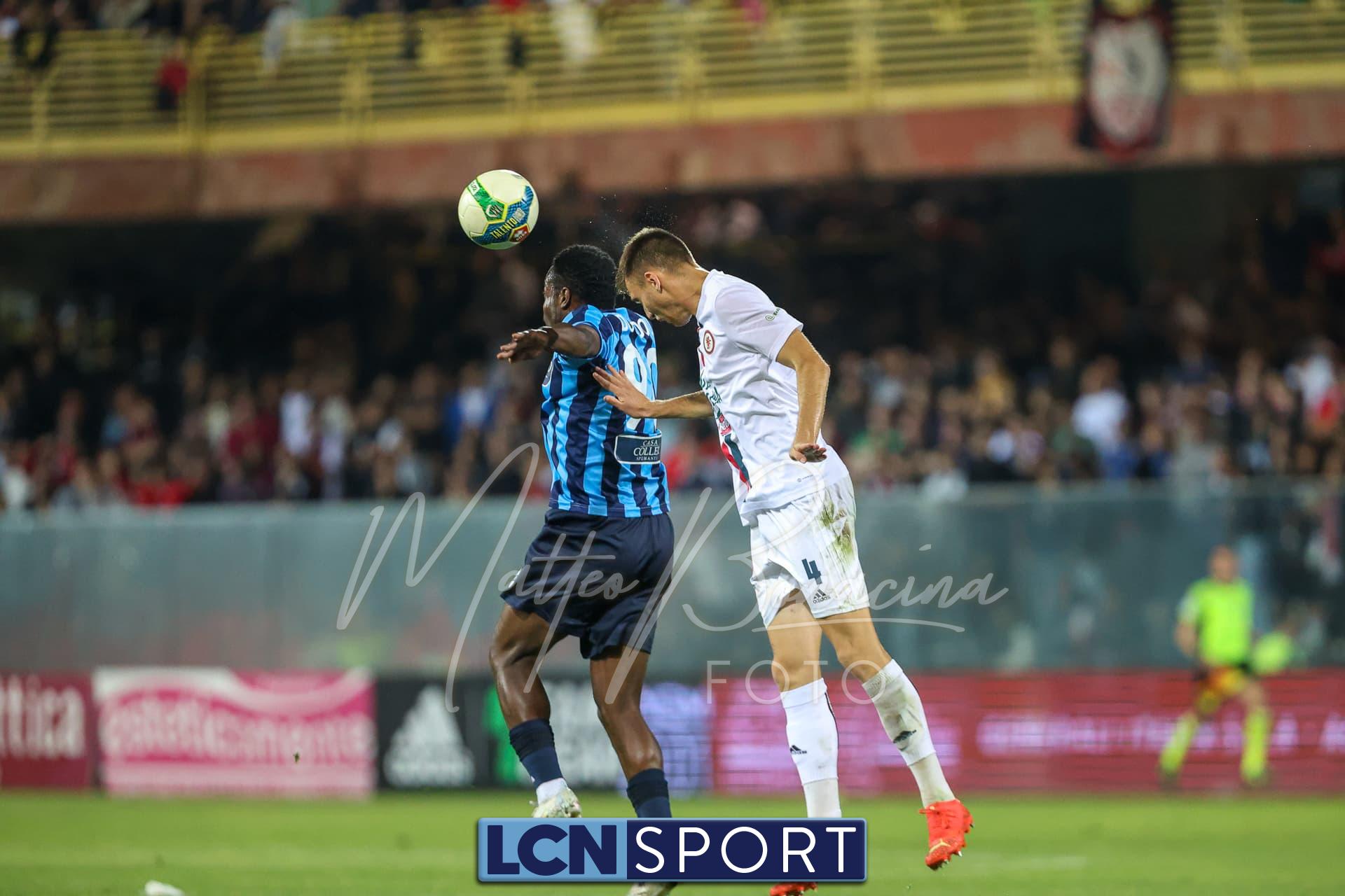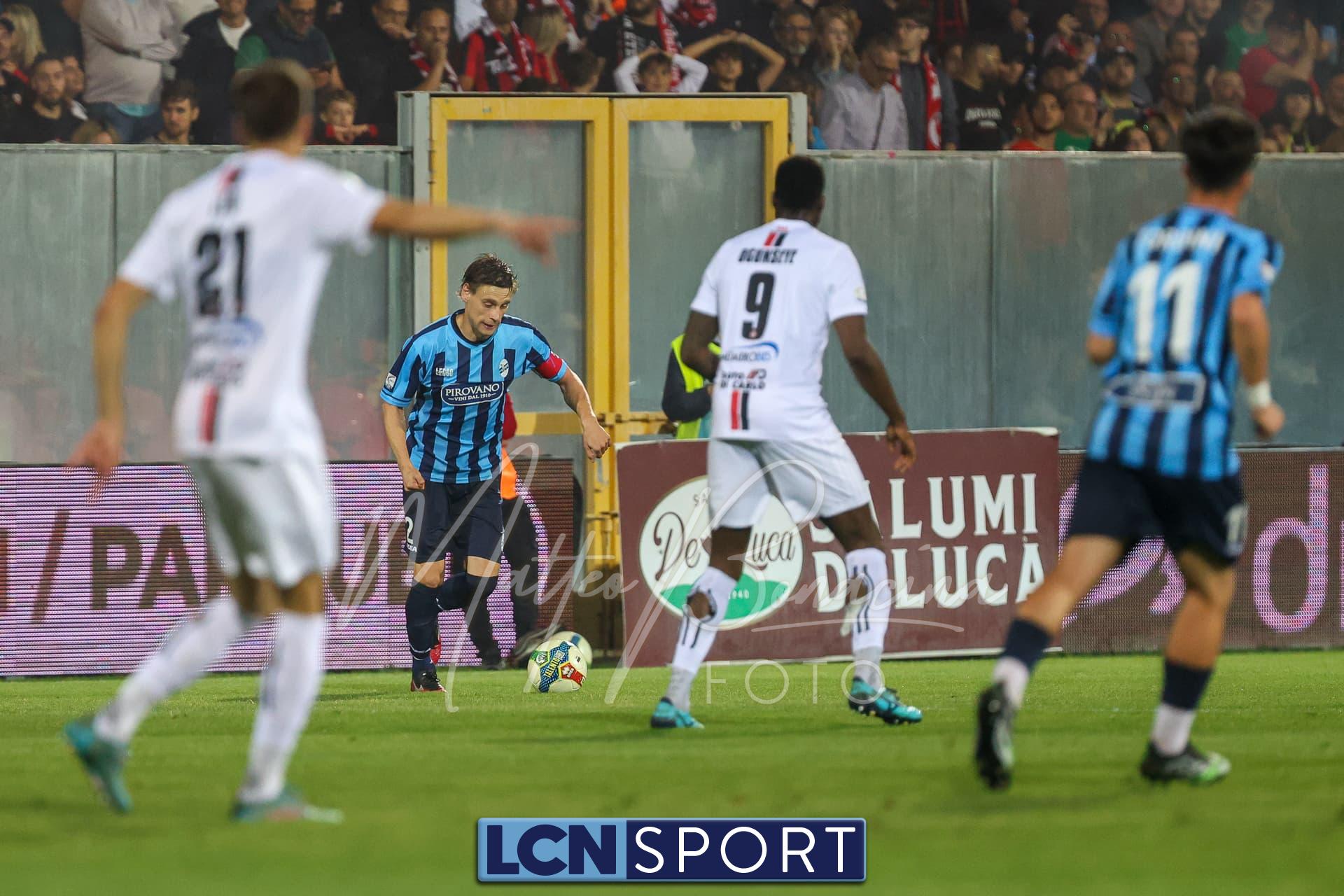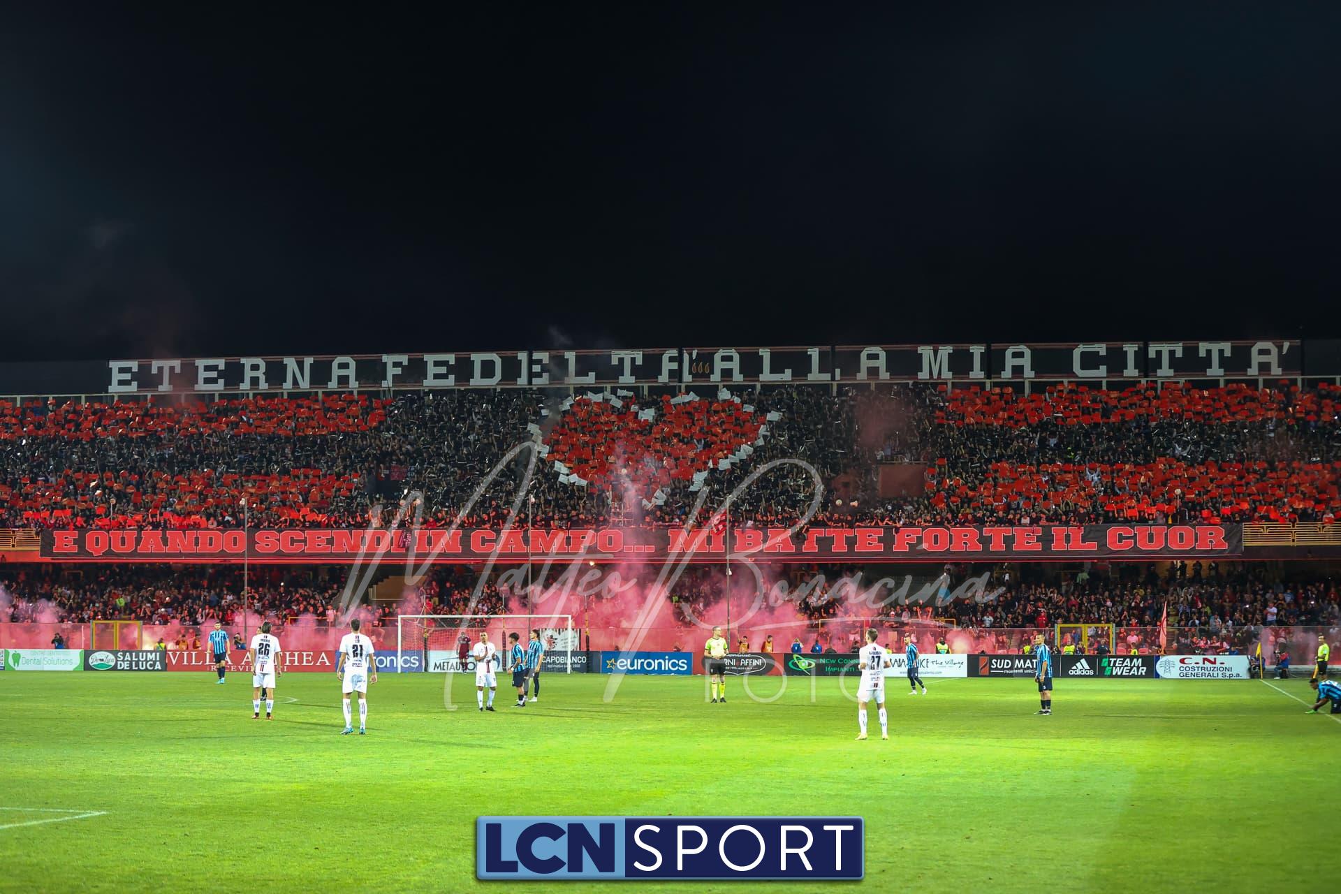Avvio di partita nella nebbia dei fumogeni, l’arbitro è costretto a sospendere il gioco già dopo un minuto e mezzo. Cross insidioso di Costa su cui Frigerio non arriva, ma Melgrati è tratto in inganno e deve smanacciare in angolo. Dal corner, al 7′, arriva il gol del vantaggio rossonero con lo stacco imperioso di Leo, su cui Melgrati è miracoloso, ma il rimpallo sullo stesso difensore dei pugliesi si insacca (il controllo del Var convalida il gol).