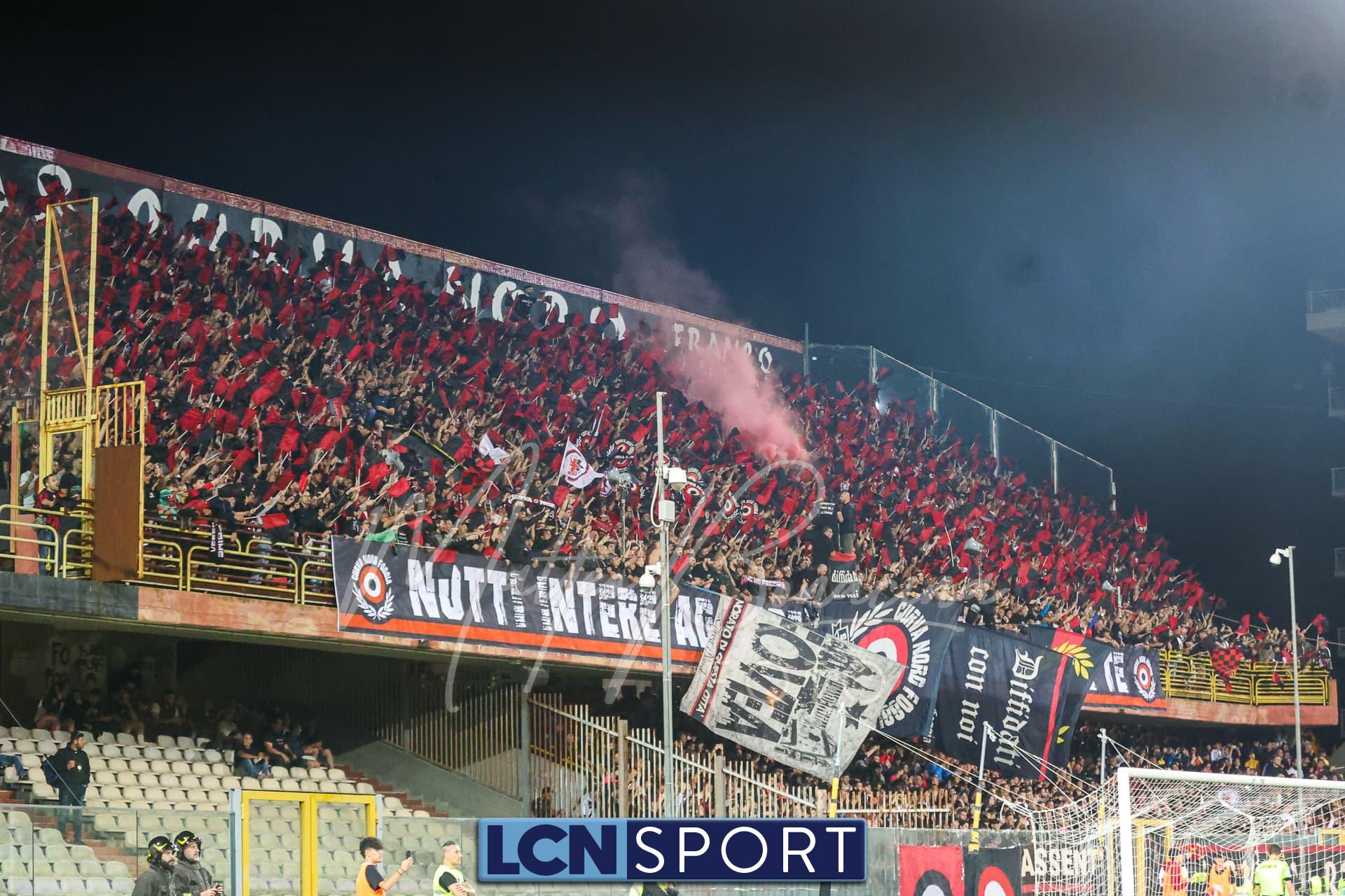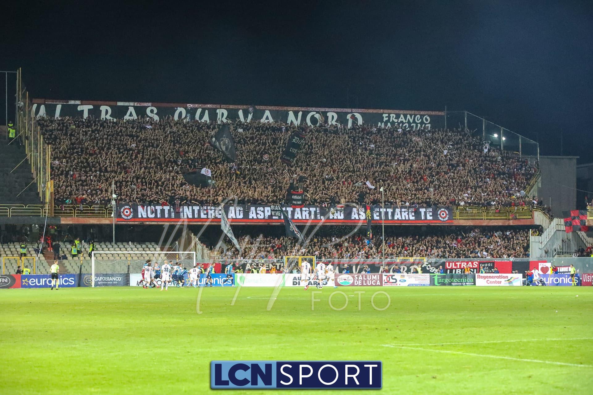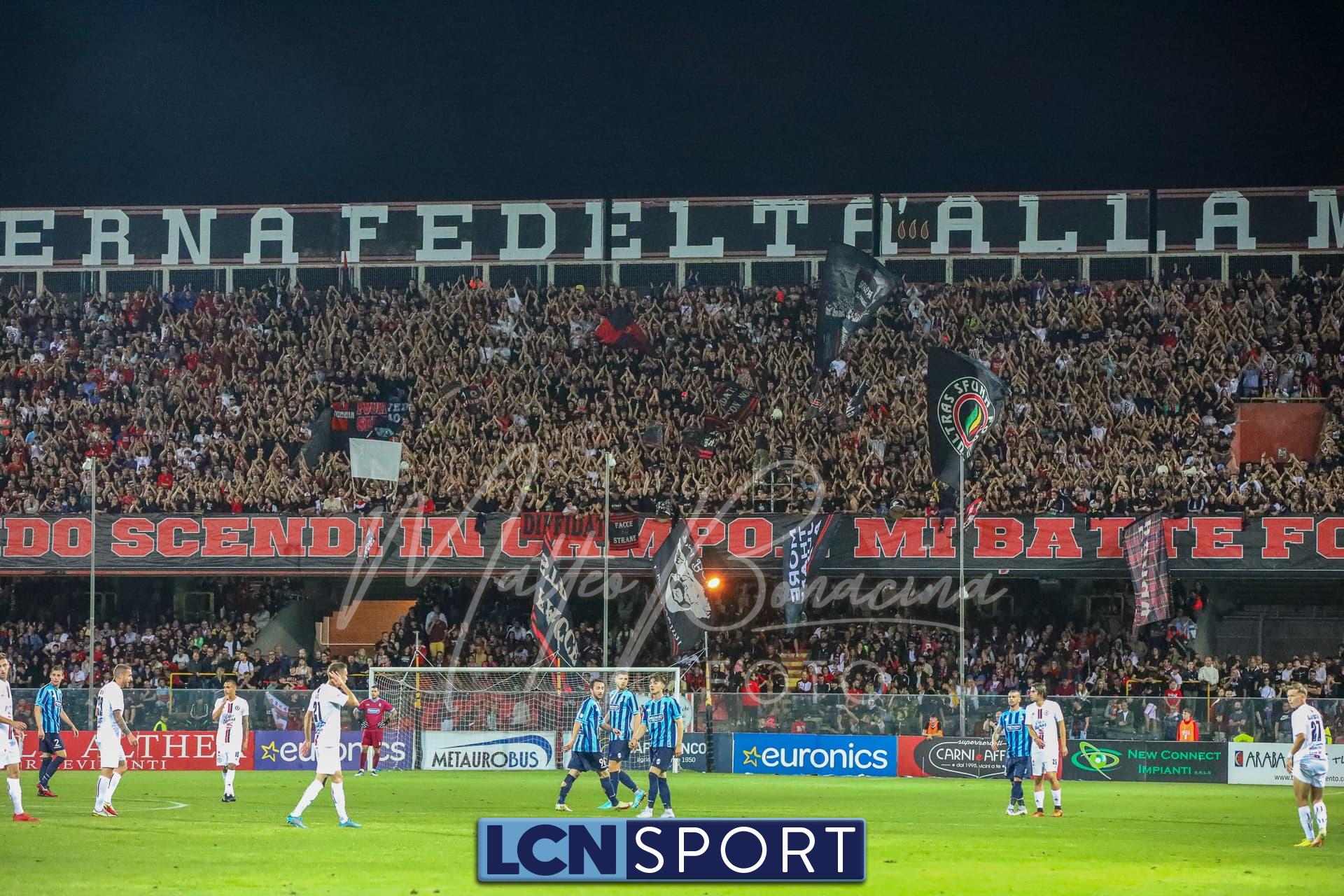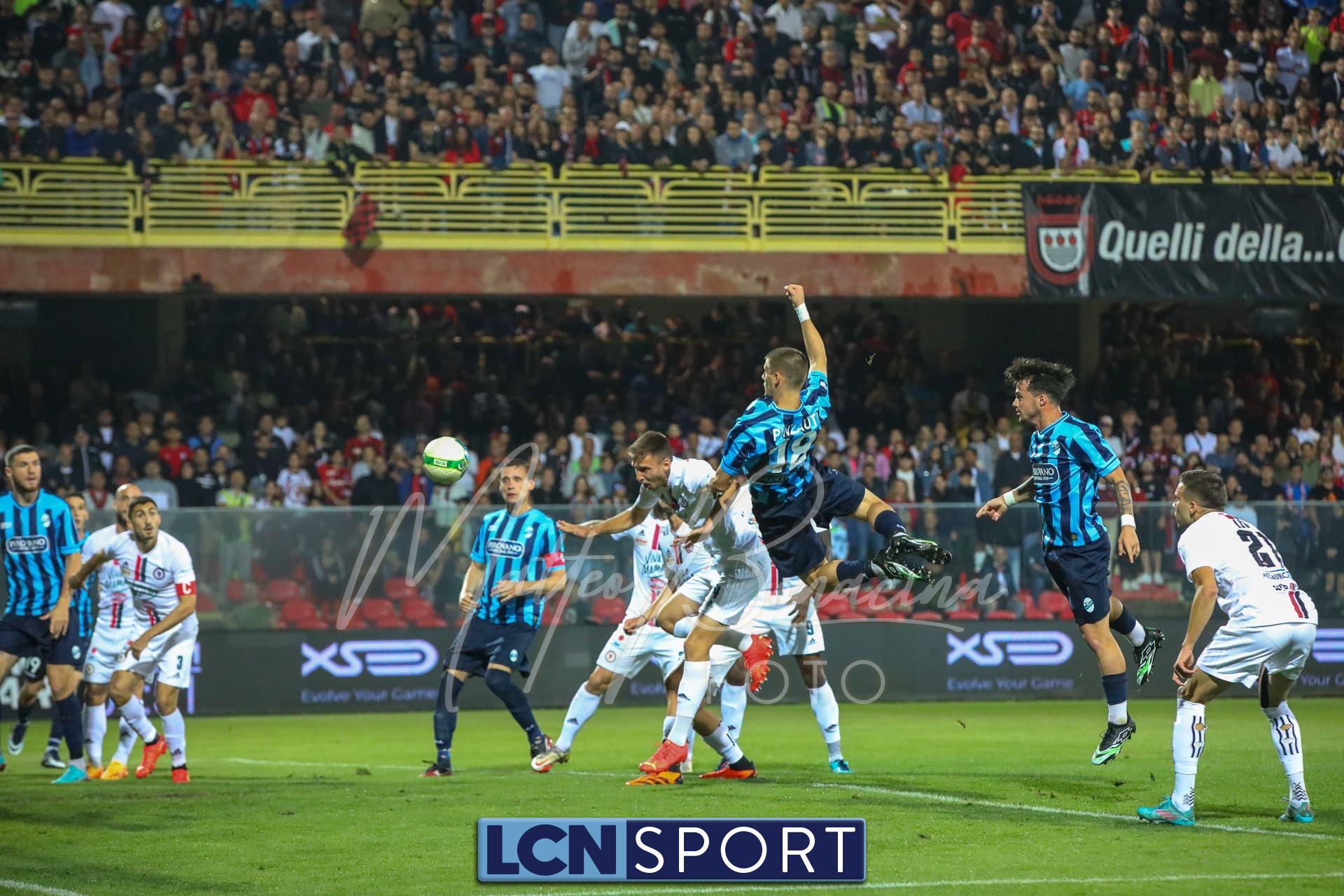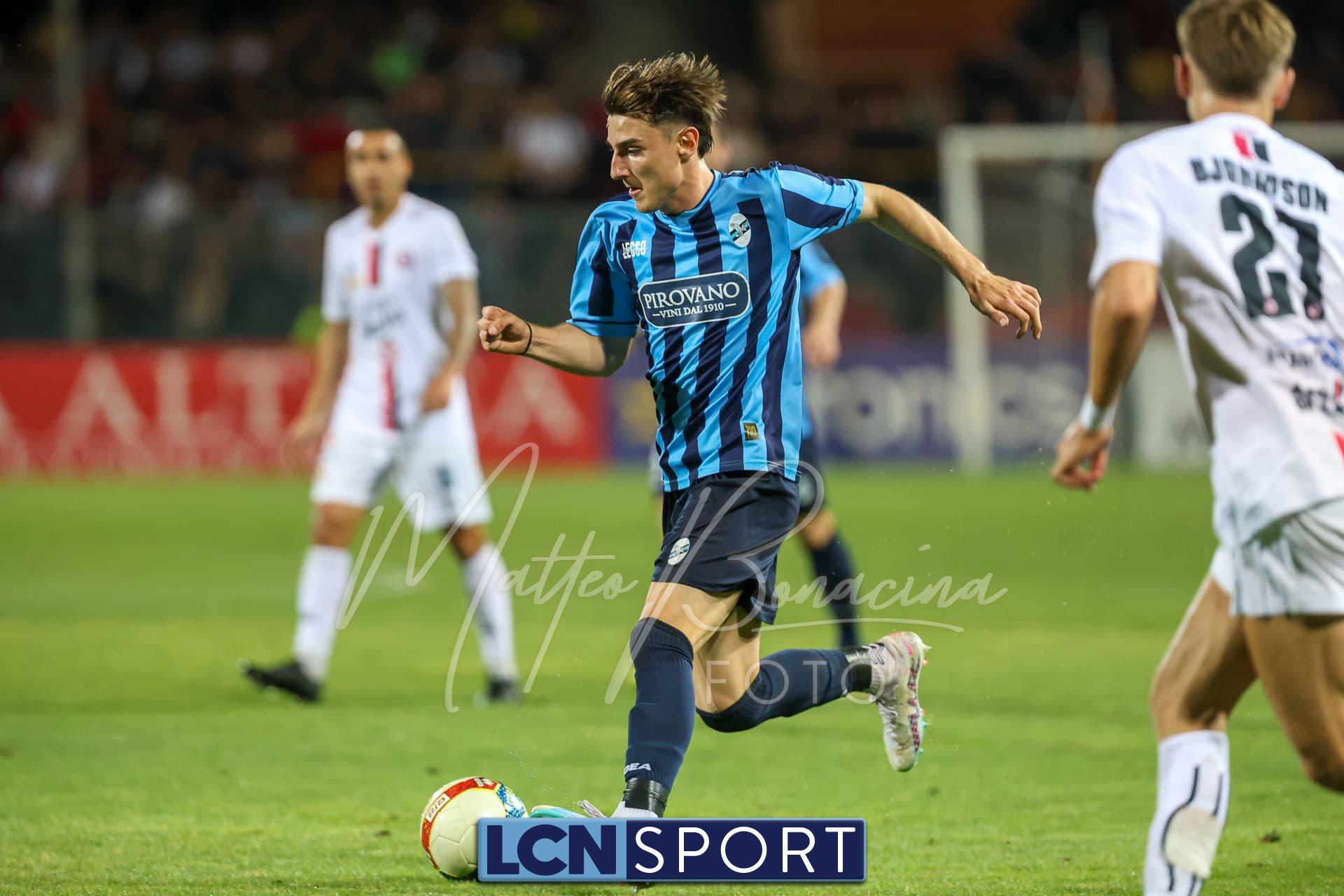 Avvio di partita nella nebbia dei fumogeni, l’arbitro è costretto a sospendere il gioco già dopo un minuto e mezzo. Cross insidioso di Costa su cui Frigerio non arriva, ma Melgrati è tratto in inganno e deve smanacciare in angolo. Dal corner, al 7′, arriva il gol del vantaggio rossonero con lo stacco imperioso di Leo, su cui Melgrati è miracoloso, ma il rimpallo sullo stesso difensore dei pugliesi si insacca (il controllo del Var convalida il gol).