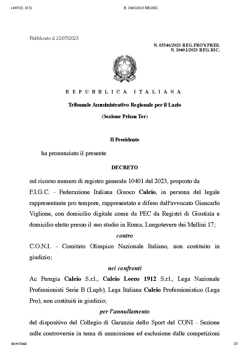 Parliamo al plurale non a caso: il 21 luglio il Lecco, rappresentato e difeso dagli avvocati Salvatora De Lorenzis, Domenico Zinnari e Antonio Caiffa, collaboratore dello studio Sticchi Damiani di Lecce, ha depositato il ricorso contro il Comitato Olimpico Nazionale e il Collegio di Garanzia dello Sport presso la Sezione 1T del Tar, che ha fissato «per la trattazione collegiale del ricorso l’udienza pubblica del prossimo 2 agosto». Passo fatto lo stesso giorno dalla stessa Figc contro il Comitato Olimpico Nazionale Italiano per mano dell’avvocato Giancarlo Viglione per chiedere l’annullamento della decisione presa praticamente all’unanimità dall’organismo di governo dello sport nel Belpaese: come detto più volte su questi canali, la Federazione stessa ha deciso di battere la strada della giustizia ordinaria per difendere la decisione di ammettere il Lecco alla prossima Serie B.