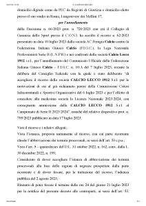 Decisione promossa dallo stesso legale Viglione durante il dibattimento al Coni che ha visto prevalere il Perugia: «Certe scadenze erano state fissate quando la finale era fissata per l’11 giugno: i vincitori avrebbero avuto 9 giorni per la documentazione. Il Lecco non avrebbe mai potuto farlo per il 15, prima ancora che il match si giocasse, ma nemmeno per il 20. Ha fatto tutto in meno dei 9 giorni che avevamo considerato. Il Lecco ha meritato la promozione sul campo. La Figc ha sbagliato: quando la Lega Pro ha cambiato il calendario, il 27 aprile, avrebbe dovuto modificare il termine per l’iscrizione della vincitrice dei playoff. Tra l’altro il Lecco aveva presentato istanza di proroga, senza risposte. L’errore commesso non può abbattersi sul Lecco, laddove i 9 giorni erano stati rispettati». Il 29 agosto, invece, si terrà l’udienza al Consiglio di Stato.
