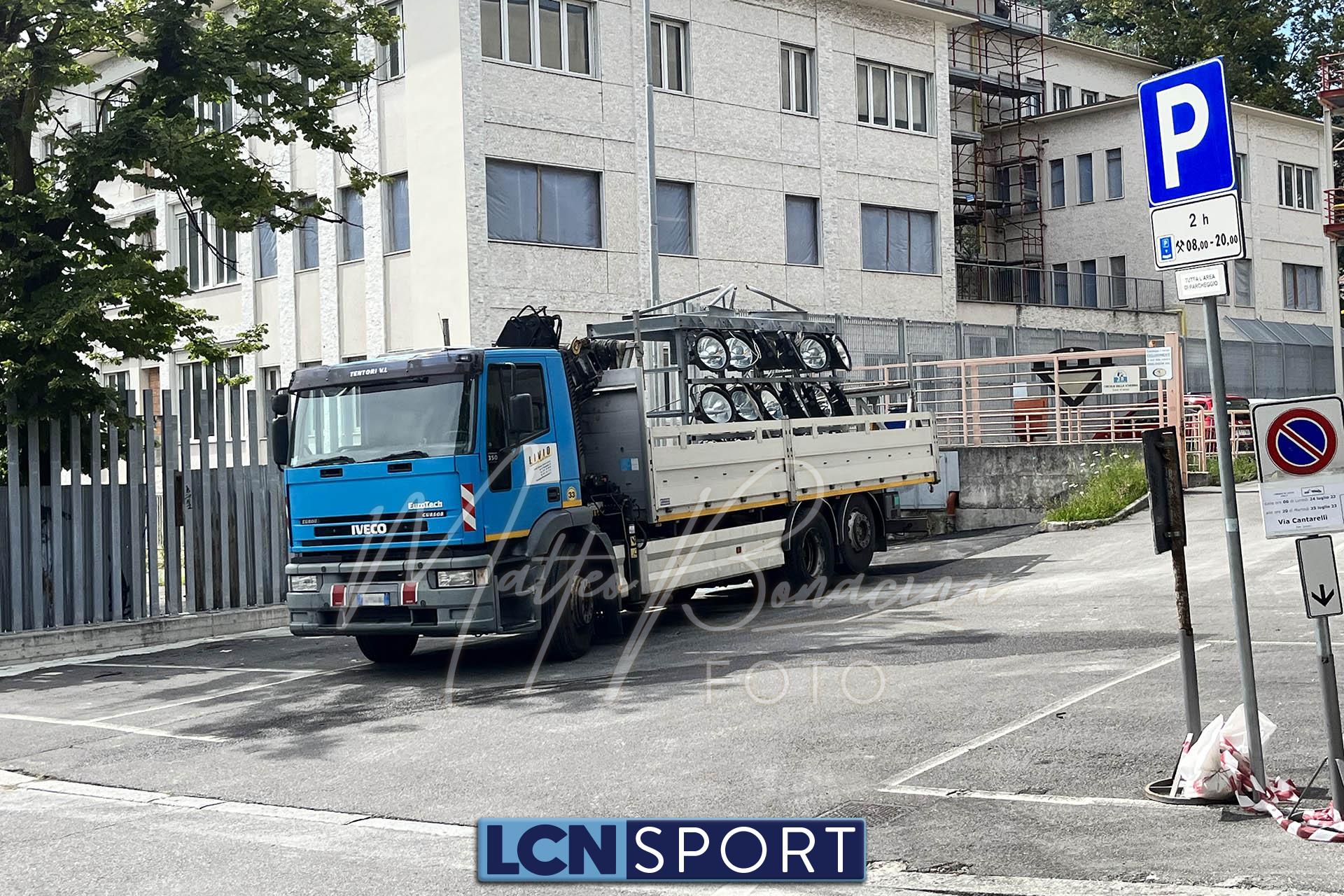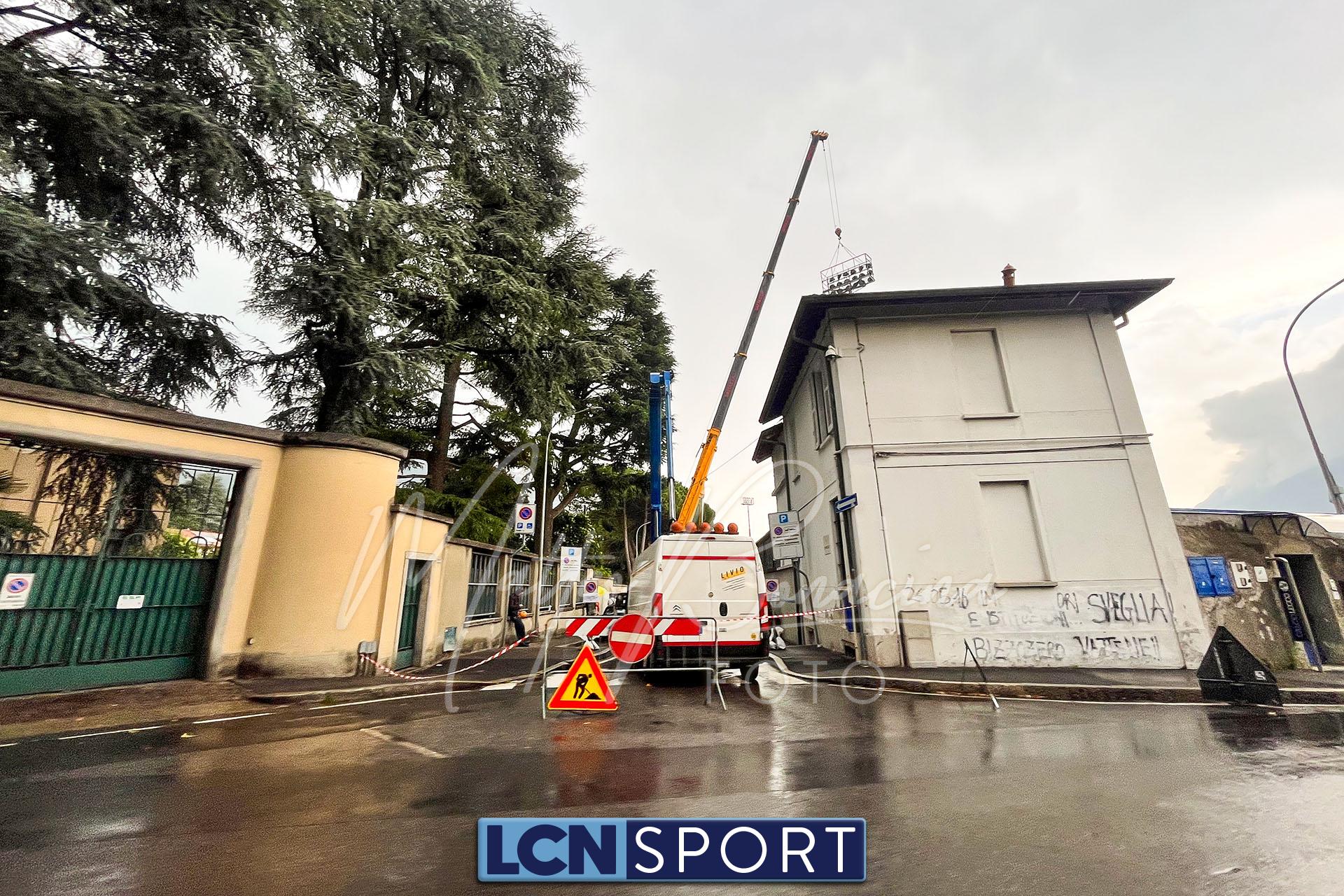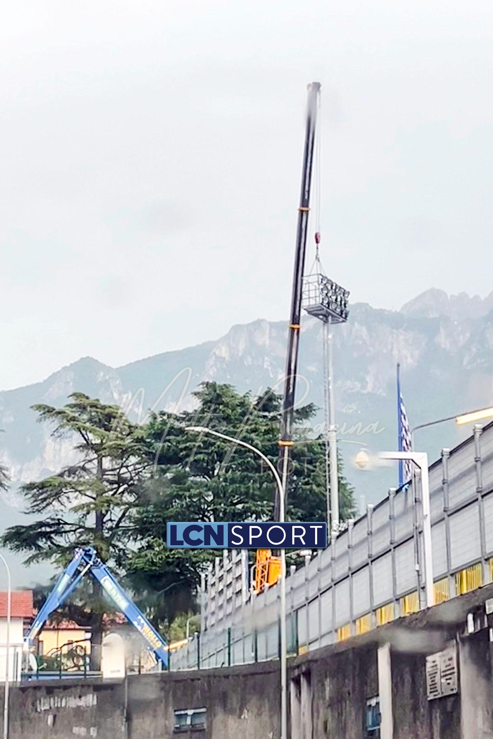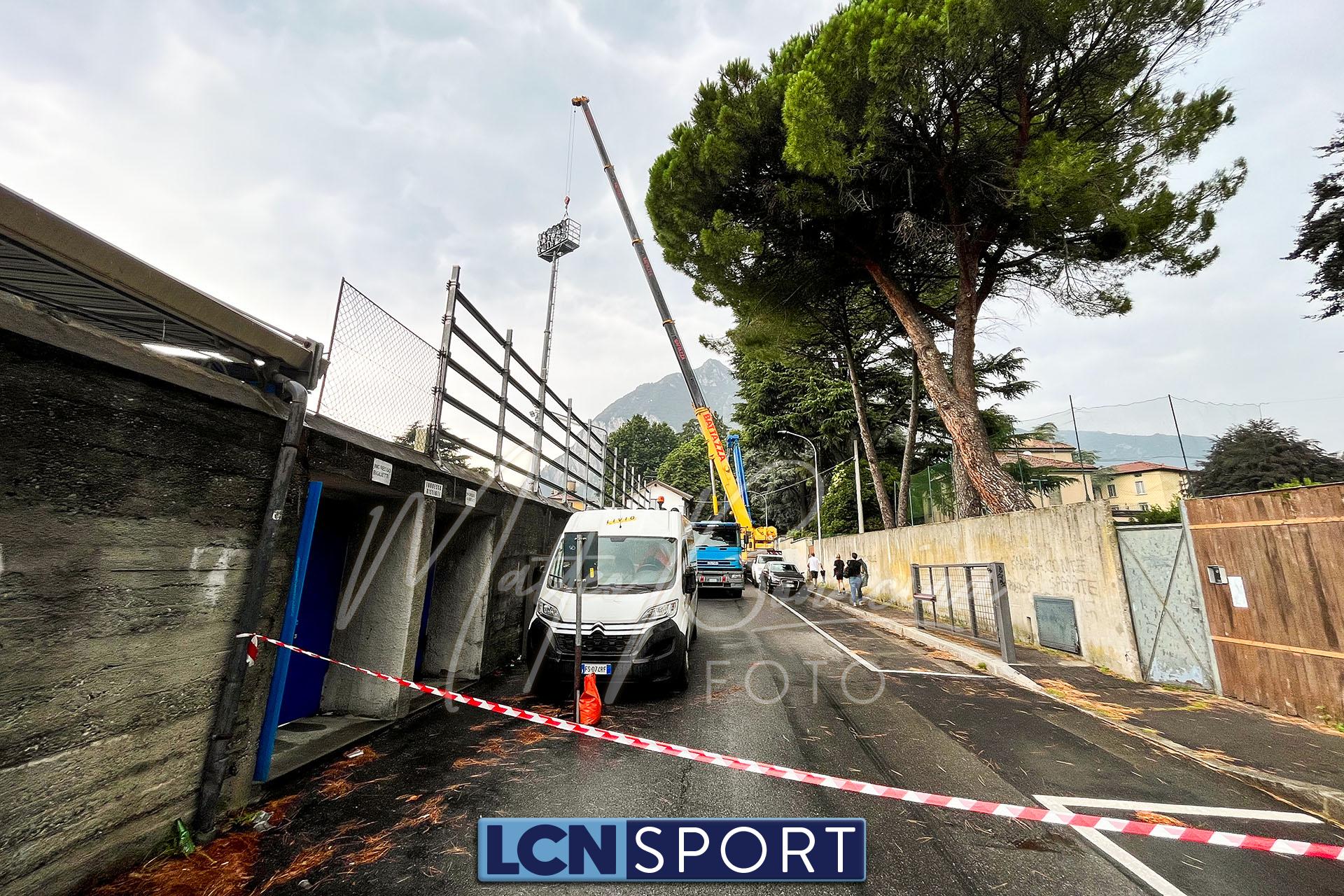 Le torri faro sono nude. Durante la mattinata di martedì 25 luglio i tecnici sono saliti sulle strutture e hanno portato a termine la rimozione dell’impianto ancora presenta nella zona tra la Curva Sud e la Tribuna dello stadio “Rigamonti-Ceppi” di Lecco. Come spiegato già nei giorni scorsi, infatti, nonostante l’attesa legata ai ricorsi presentati dalla società e dalla Figc contro la decisione del Collegio di Garanzia dello Sport del Coni – discussione fissata per il 2 agosto – in via don Pozzi non ci si è letteralmente mai fermati: nei giorni scorsi sono state rimosse le panchine, che saranno sostituite, così come sono state smontate le luci posizionate sopra la tribuna. Rinnovata l’ordinanza che riguarda la chiusura di via Pascoli, che mercoledì 26 luglio tornerà a essere chiusa al transito veicolare: al posto del vecchio impianto i tecnici della Livio Impianti, azienda incaricata di eseguire i lavori, saranno installati dei moderni pannelli a led. Non solo: sempre in questi giorni si stanno effettuando le gettate di cemento laddove verranno posizionati i tornelli.
