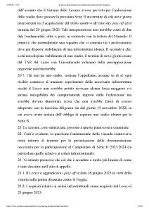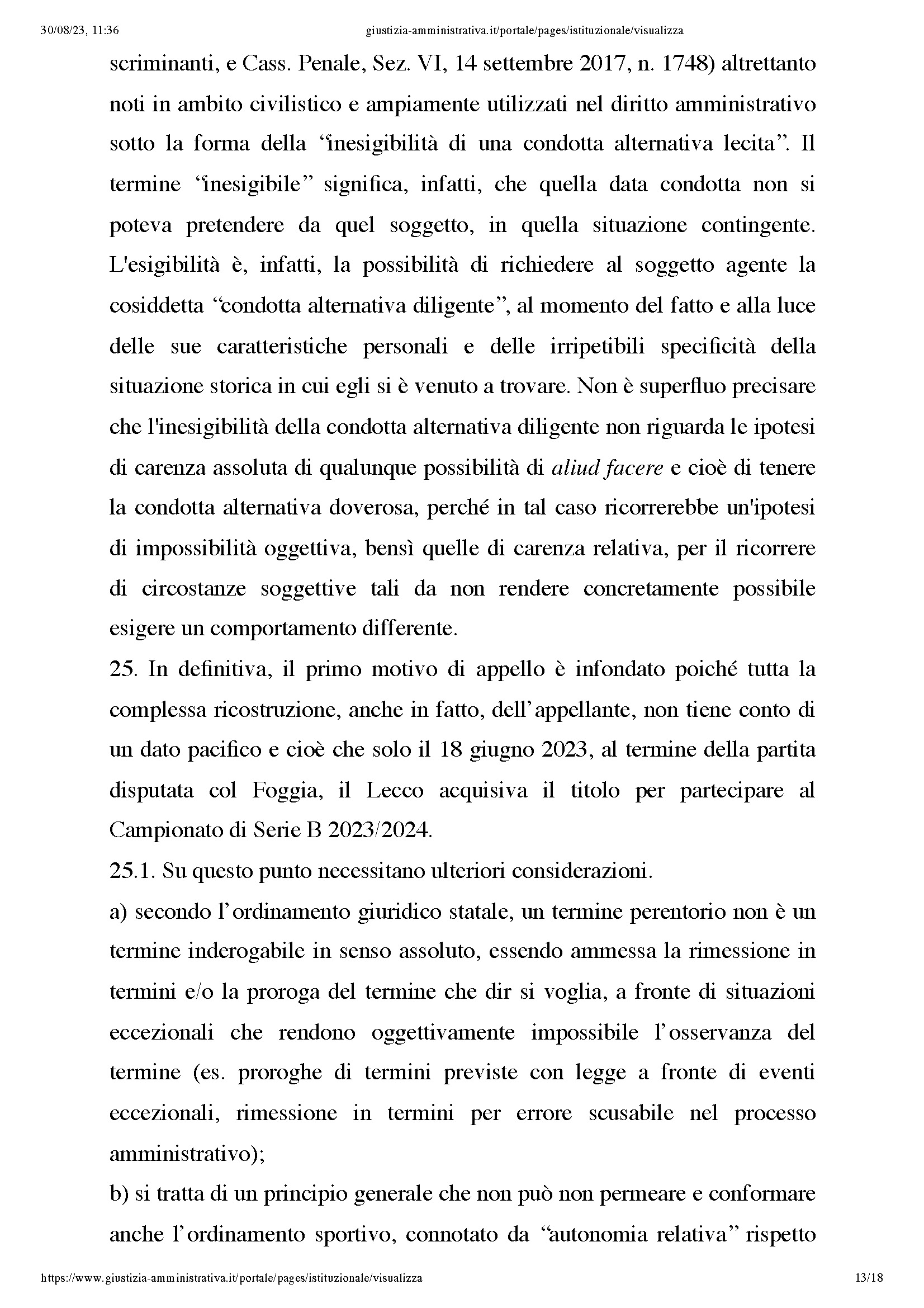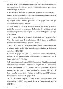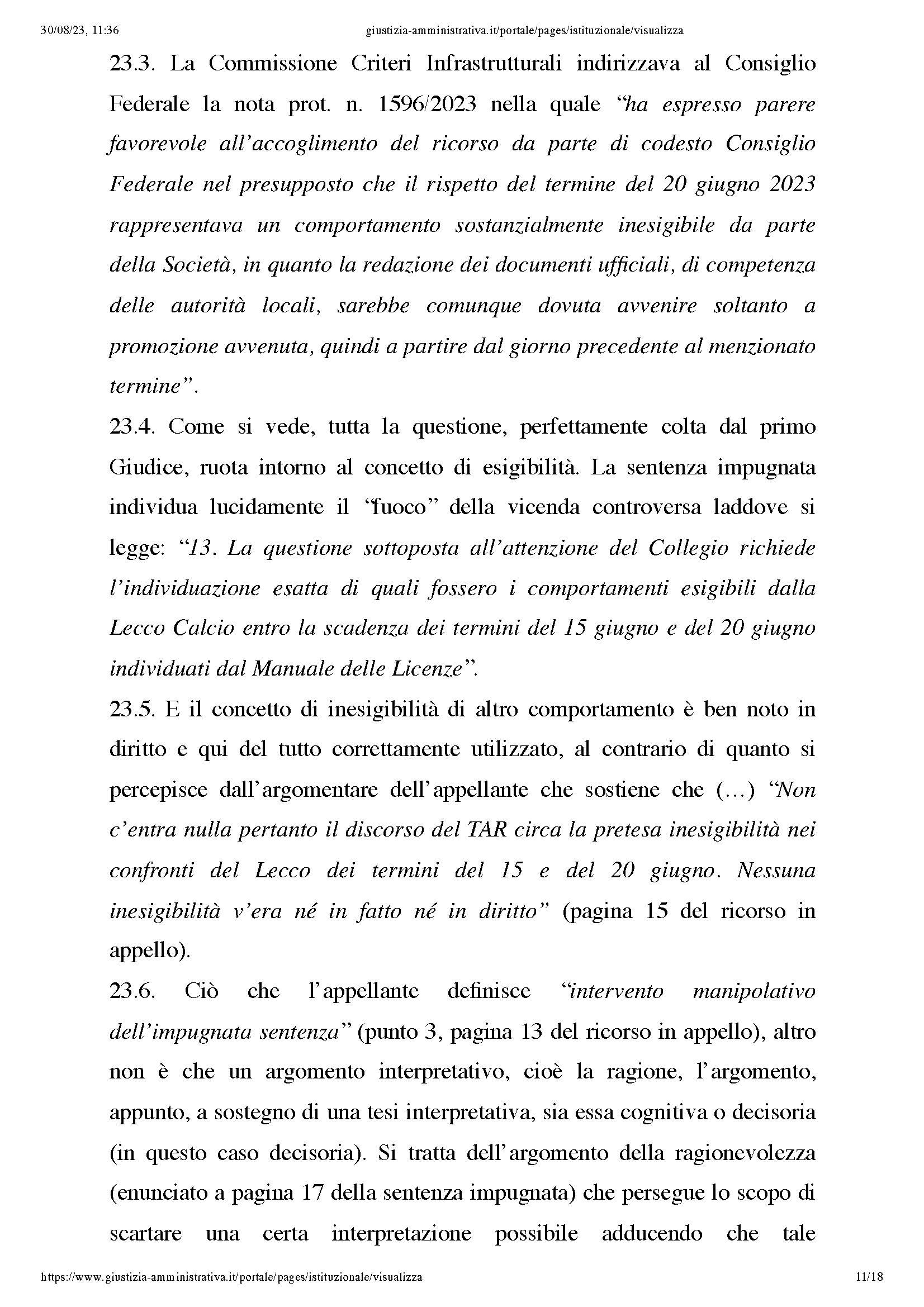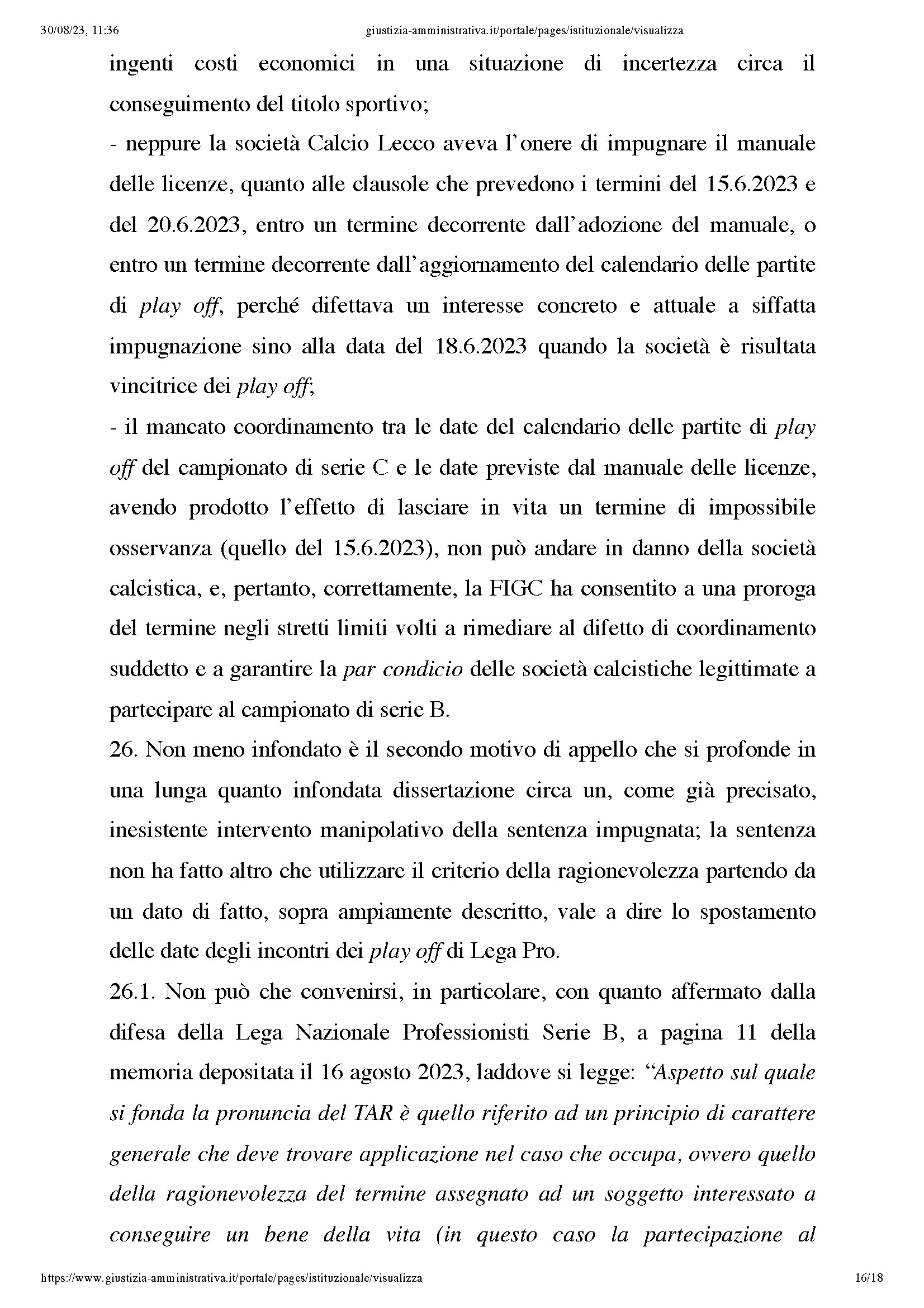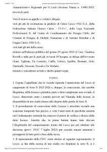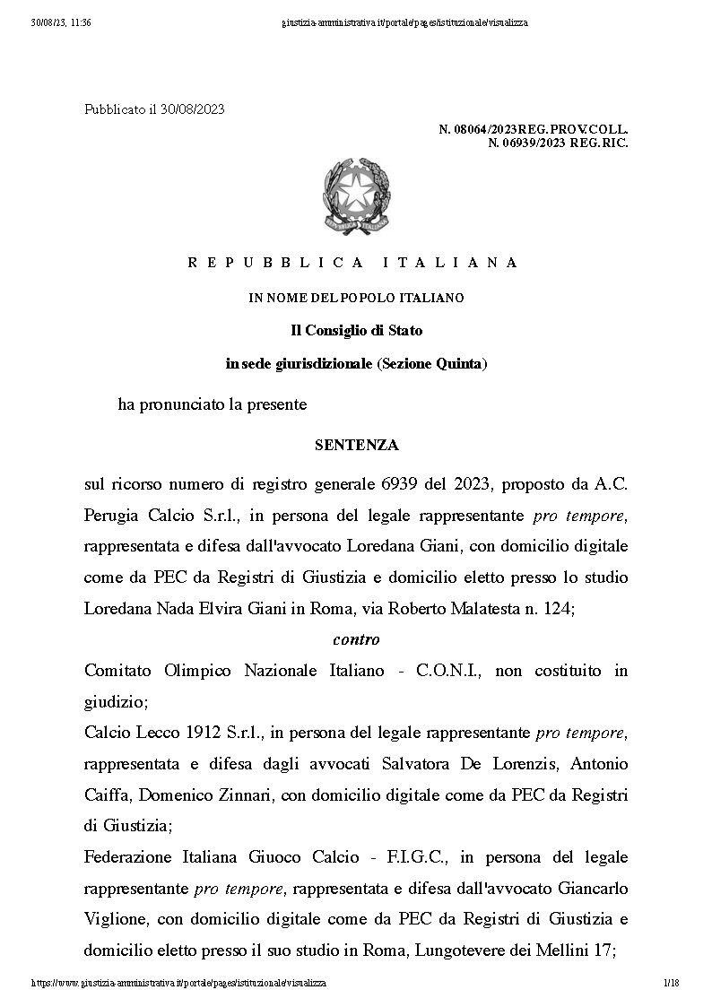 Il Consiglio di Stato ha deliberato: per il Lecco si aprono definitivamente le porte della Serie B. La decisione del presidente Paolo Giovanni Nicolò Lotti è stata comunicata dalla V Sezione che ha avuto in Gianluca Rovelli il proprio relatore ed estensore. La sentenza è completa di motivazioni: 28 punti che ribadiscono il concetto di inesigibilità del termine perentorio. Si chiude così una pagina infinita, che ha visto partire comunque il campionato di cadetteria: manca l’ufficialità, ma si dovrebbe partire con Lecco-Catanzaro del 3 settembre, da disputarsi allo stadio “Euganeo” di Padova. Inammissibile il ricorso del Foggia. Bocciato, ed è ufficiale, anche il ricorso presentato dalla Reggina: il nome della ventesima squadra è quello del Brescia.