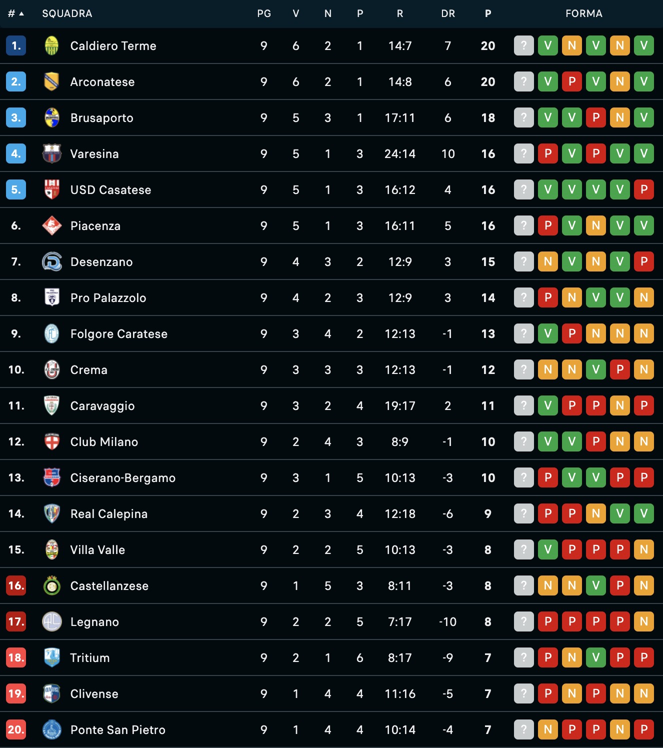 I risultati della 9^ giornata