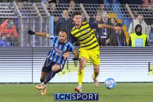 Episodio importante alla mezz’ora: Hernani, già ammonito, rifila un pestone sul piede di Degli Innocenti e lascia il Parma in dieci uomini. Al 34′ clamorosa occasione nell’area emiliana: prima conclusione di Buso respinta non si sa come dal portiere, Lepore viene murato e sul rimpallo Novakovich e Lemmens si ostacolano al tiro; palla fuori di un niente. Da corner, sempre Novakovich non trova il pallone, alto.