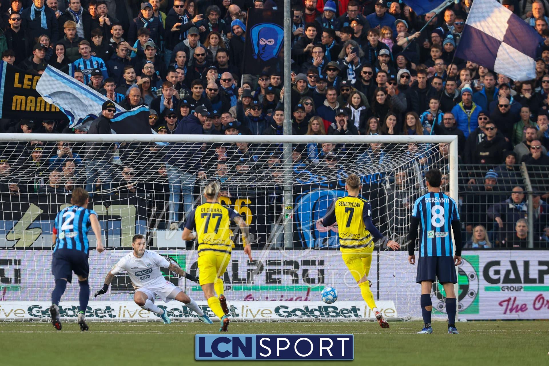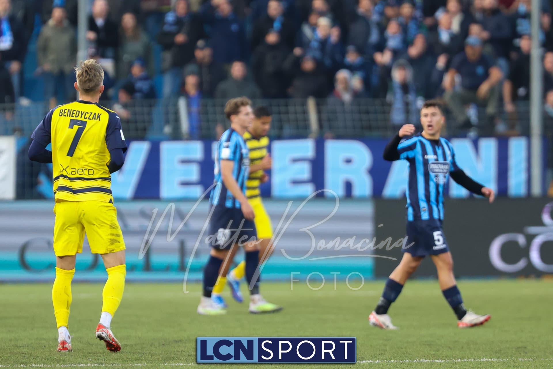 Lecco che si schiera con un 4-3-3 in cui Lepore è esterno “alto” a dare sostanza in campo alla squadra. Partita equilibrata, primo rischio all’8′ con palla di Estevez da destra e Bonny anticipato nell’area piccola da Lemmens. C’è però un check del Var per il contatto, l’arbitro riguarda e concede rigore. Sul dischetto va Benedyczak che calcia centrale e realizza.