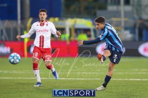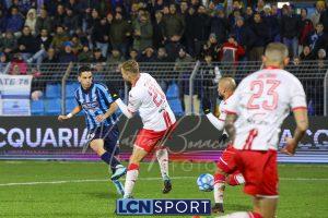 Ci si prova solo da fuori: minuto 12 Sibilli dai venticinque metri con il destro, palla fuori non di molto. I pugliesi ci provano al 17′ con il cross di Dorval da destra, Nasti si muove con i tempi giusti ma non riesce a inquadrare la porta di testa. Altro tiro dalla distanza, da destra, di Lemmens al 20′: troppo debole, nessun problema per Brenno. Bella giocata personale di Ricci al 23′, a sinistra: sombrero su un difensore e poi conclusione forte, ma Saracco è pronto.