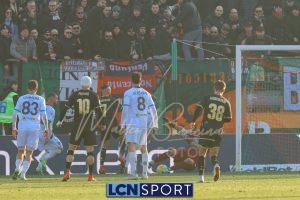 Il Venezia ha una grande occasione al 14′: Johnsen ne salta due, finta e controfinta, conclusione deviata da Lemmens e palla che sfiora il palo alla destra del rientrante Melgrati. Al 18′ episodio a favore del Lecco: Sersanti entra in area e viene atterrato da Sverko, Cosso indica subito il dischetto. Lepore è freddissimo e insacca alla destra di Joronen che indovina l’angolo ma non può arrivarci: 1-0 per i blucelesti.