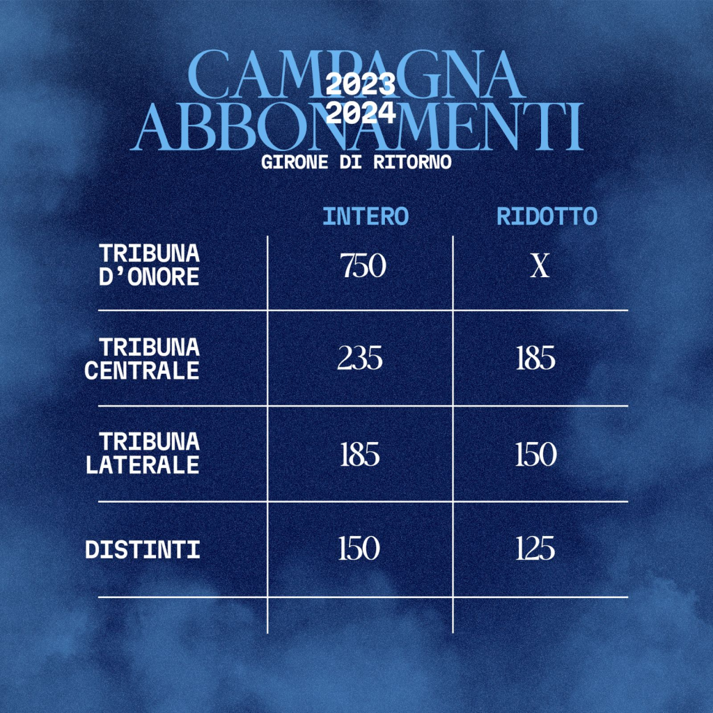 - TRIBUNA CENTRALE 235€ (intero) e 185€ (ridotto)