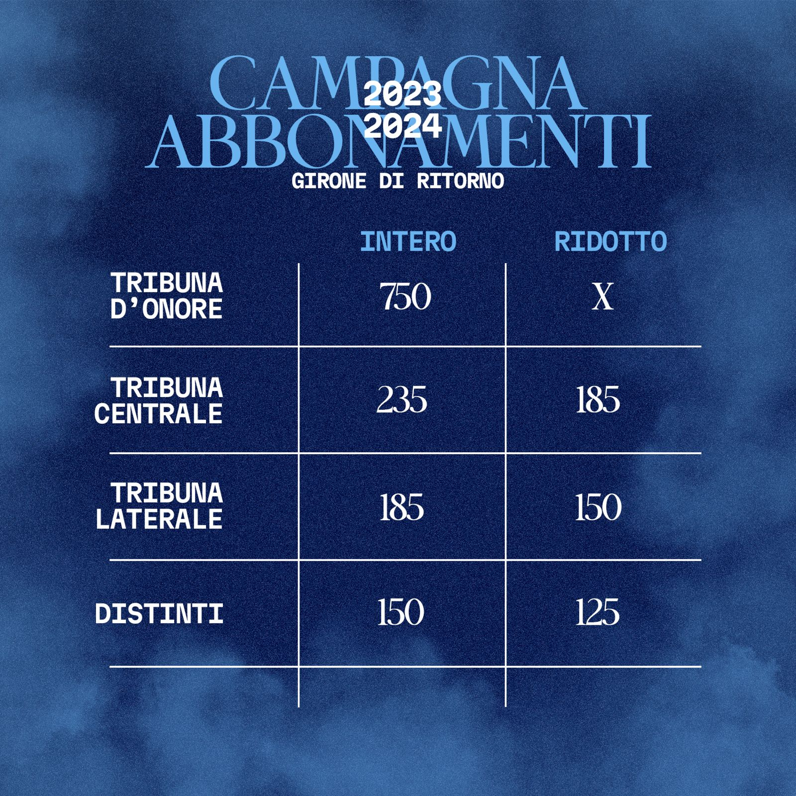 Calcio Lecco 1912 è lieta di comunicare che, a partire da Mercoledì 10 Gennaio 2024 alle ore 15:00, riapre ufficialmente la campagna abbonamenti valevole per il girone di ritorno di Serie BKT presso la sede di via Don Giuseppe Pozzi 6 a Lecco. Saranno fruibili per l’acquisto gli abbonamenti nelle tribune e nei distinti, curva nord esclusa.
