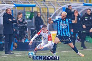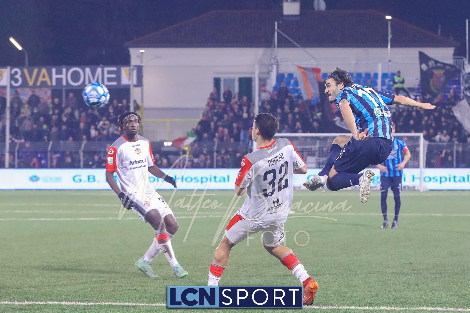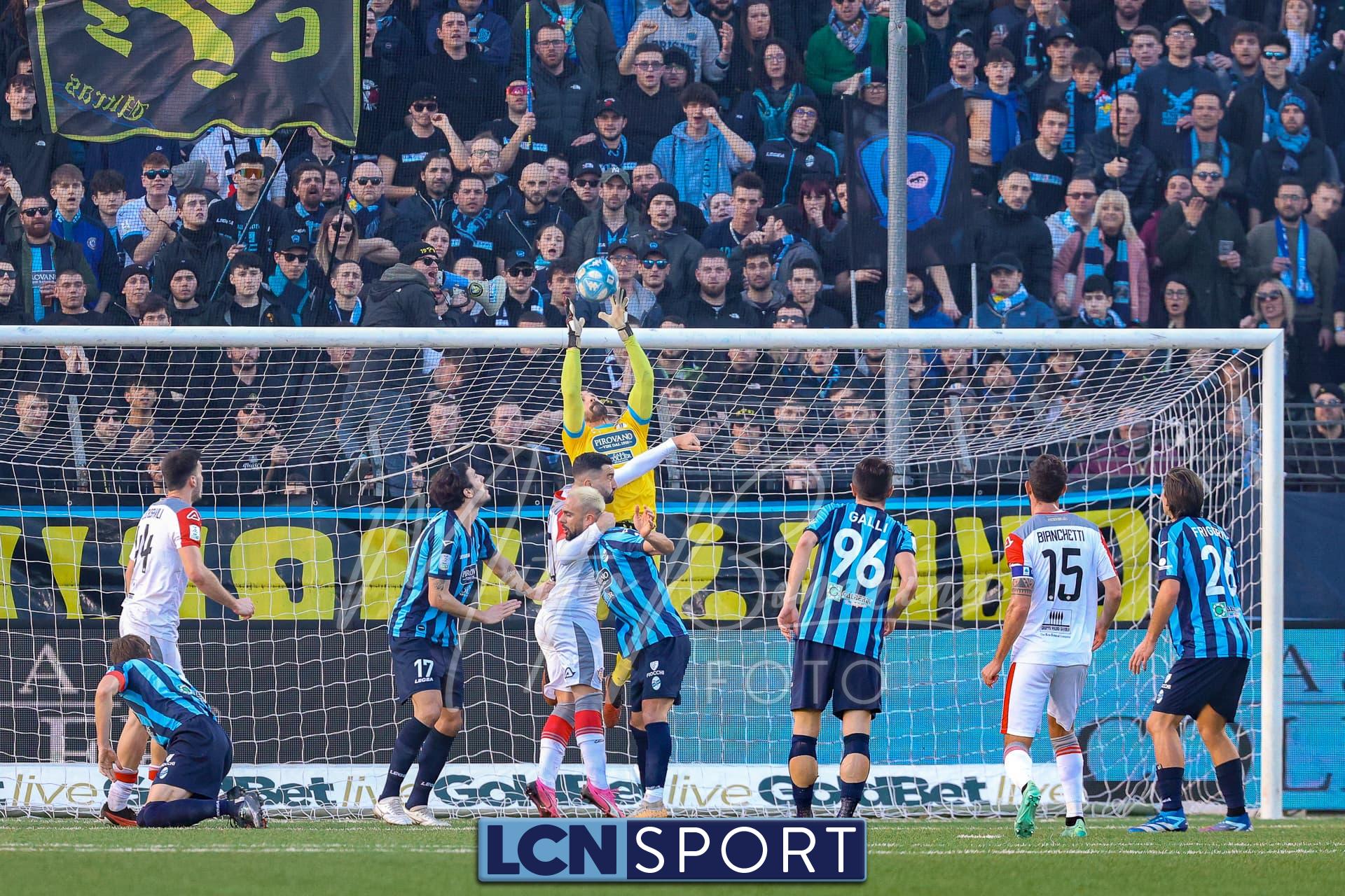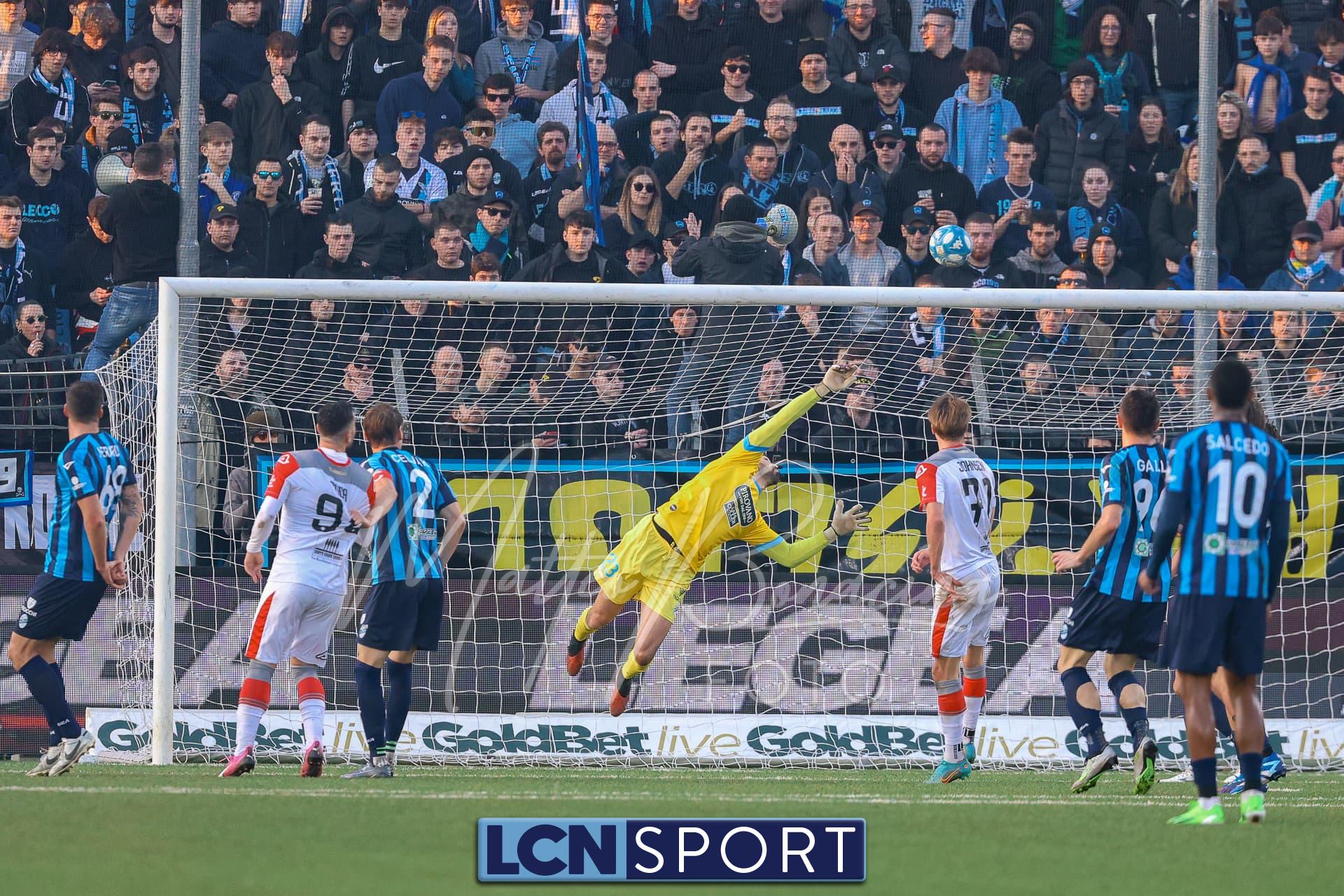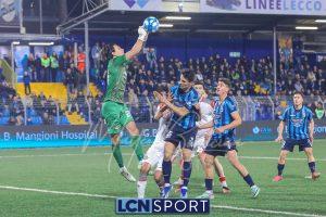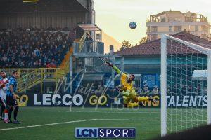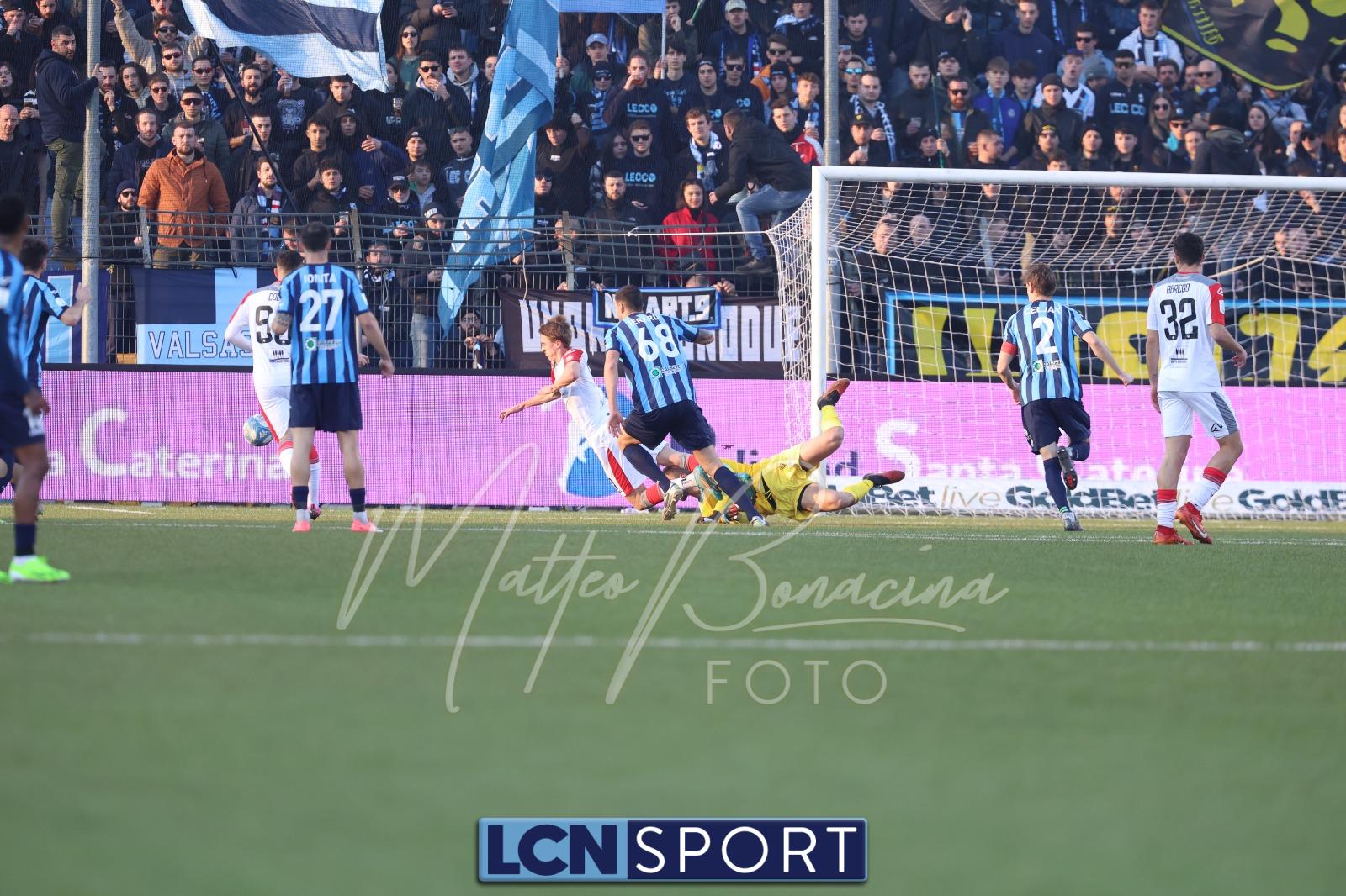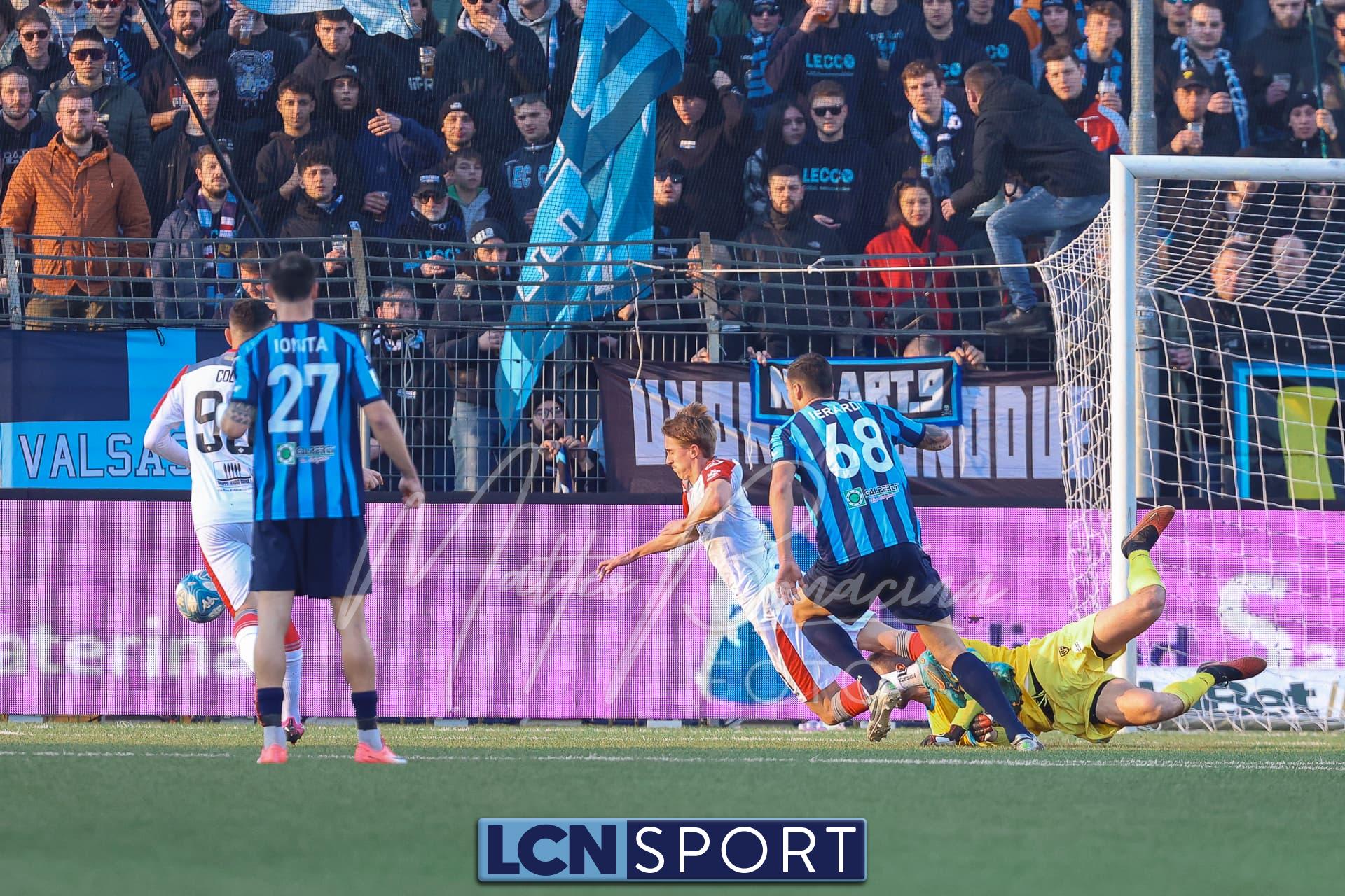 Buona azione del Lecco al 21′ sulla destra, Frigerio serve al centro Listkowski che prova una difficile rovesciata, facile per Saro. Alla mezz’ora sfortunatissimo Ierardi il cui tocco si impenna e serve involontariamente Coda, Galli è prodigioso nel contrasto per salvare il risultato.