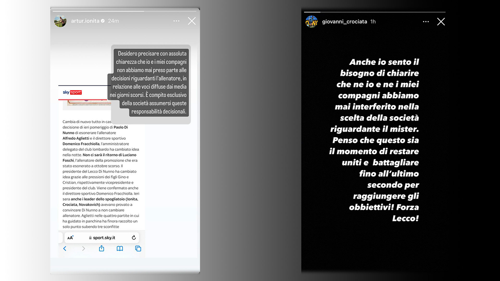 «Desidero precisare con assoluta chiarezza che io e i miei compagni non abbiamo mai preso parte alle decisioni riguardanti l’allenatore, in relazione alle voci diffuse dai media nei giorni scorsi. È compito esclusivo della società assumersi queste responsabilità decisionali», ha scritto Ionita su Instagram. Crociata ha ribadito che «nè io e nè i miei compagni abbiamo mai interferito nella scelta della società riguardante il mister. Penso che questo sia il momento di restare uniti e battagliare fino all’ultimo secondo per raggiungere gli obbiettivi! Forza Lecco!».