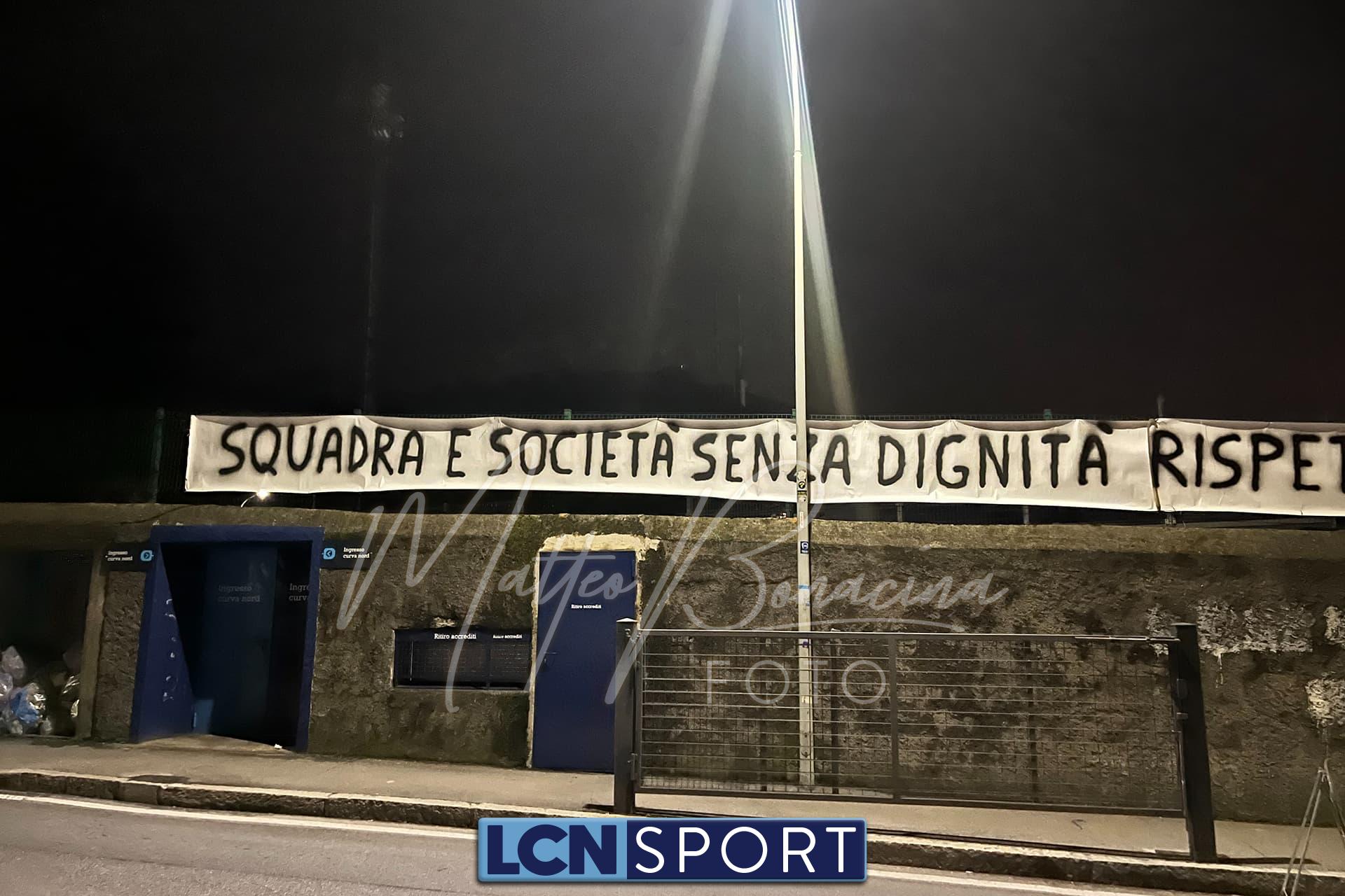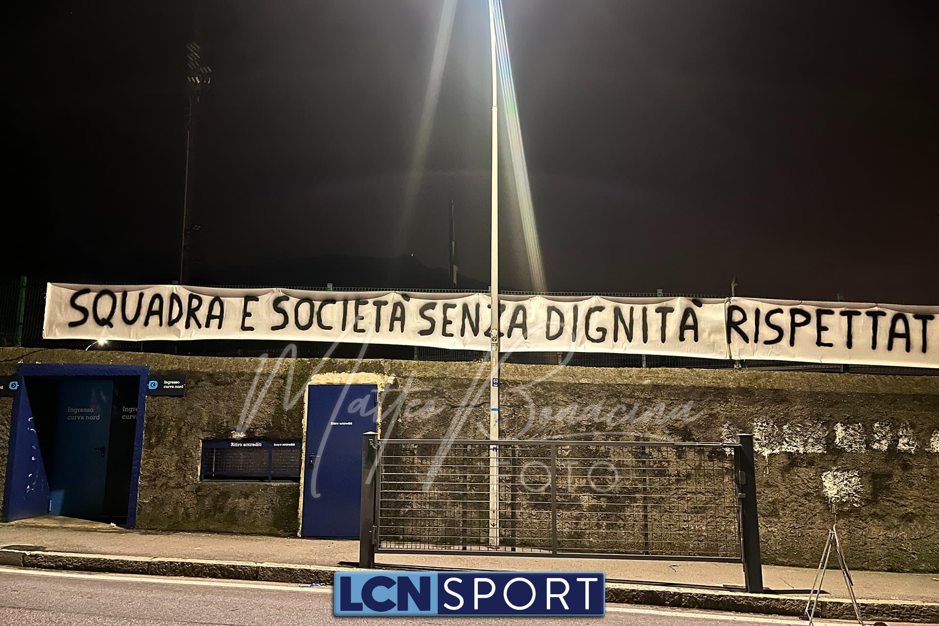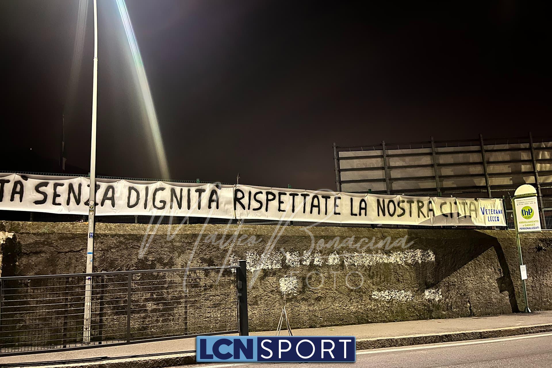 Un nuovo striscione è comparso allo stadio “Rigamonti-Ceppi” di Lecco. Nella notte tra mercoledì 6 e giovedì 7 marzo un messaggio è stato trasmesso tramite l’affissione avvenuta nella parte della Curva Nord che si affaccia su via Don Pozzi: «Squadra e società senza dignità, rispettate la nostra città», firmato dal gruppo Veterani Lecco che trova posto nel settore più caldo dell’impianto bluceleste. Solo pochi giorni fa era comparso un altro striscione di fronte al parco Belgiojoso, ancora presente sulla recinzione esterna: l’avvicinamento a Lecco-Palermo di domenica pomeriggio si fa sempre più caldo.