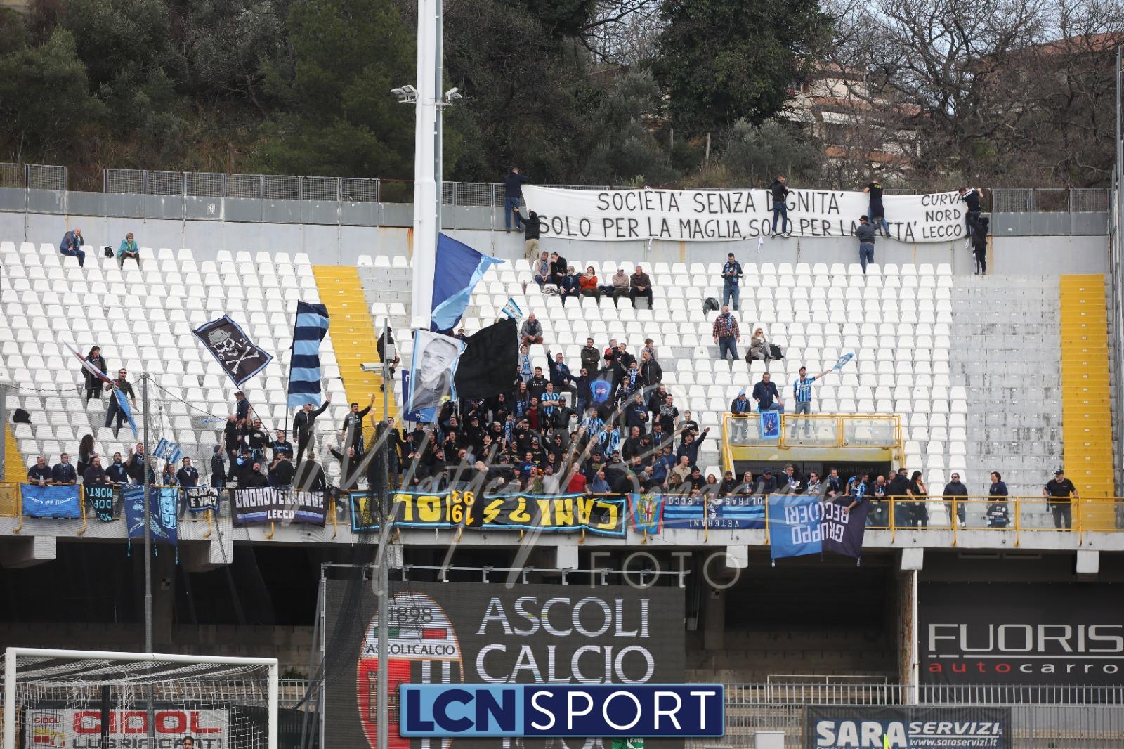 Oltre alla partita in sé, Ascoli-Lecco è stata la giornata simbolo della contestazione da parte delle due tifoserie. I tifosi di casa hanno aspettato 5′ prima d’iniziare a cantare e hanno esposto lo striscione: «5 minuti per farvi capire che il vostro tempo sta per finire», confermando l’aperto dissenso rispetto all’operato condotto dalla società in mano all’imprenditore Massimo Pulcinelli. Un secondo striscione ha toccato direttamente Marco Giannitti, direttore sportivo arrivato a ottobre e ultimamente sparito dai radar secondo quanto riferiscono le cronache locali, ma si sono sentiti distintamente cori contro Massimo De Santis, ex arbitro e consulente del patron. Per quanto riguarda i tifosi blucelesti, questi hanno esordito con un «Di Nunno non ti vogliamo» seguito da un «Di Nunno vattene da Lecco» mentre veniva esposto lo striscione: «Società senza dignità. Solo per la maglia, solo per la città»; il rapporto con l’amministratore delegato – assente ad Ascoli diversamente dal figlio Cristian Paolo, presidente – si è ormai rotto definitivamente dopo la sceneggiata pre e post Lecco-Palermo, ascoltato venerdì in Questura proprio per questo motivo. I primi minuti della contestazione bluceleste sono stati applauditi anche dalla Curva Nord dell’Ascoli, che deve averci visto qualcosa di dannatamente famigliare.