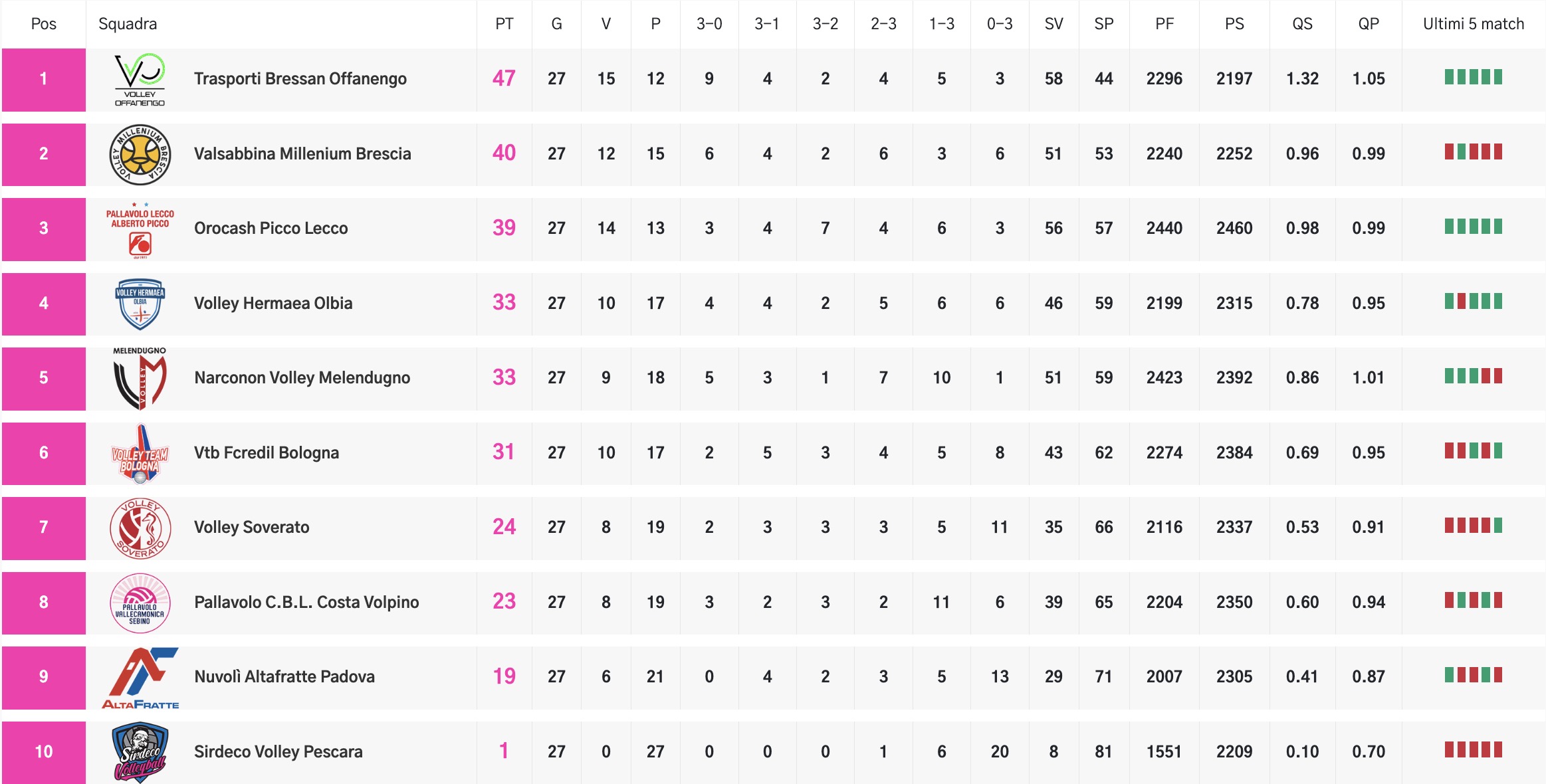 Brescia rientra in campo determinata e, con una suprema Babatunde, vola sull’8-2. Lecco non si fa stordire, Zojzi guida la rimonta e l’errore di Pamio sigla il pareggio (13-13); Kadyrova, subito dopo, è l’autrice del sorpasso (13-15). È black out totale per Brescia e l’Orocash ne approfitta volando sul 19-13 con Sassolini. Lecco è inarrestabile: Zojzi si prende prima il set point (16-24) e poi chiude i conti (17-25).