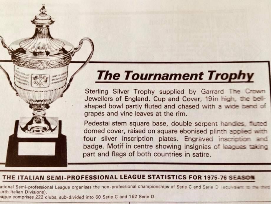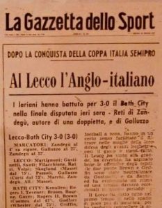 Nel 1977 anni fa l’A.C. Lecco batteva il Bath City e si guadagnava la prima (e unica) affermazione nel Trofeo Anglo-Italiano, competizione calcistica tra club italiani e inglesi svoltasi dal 1970 al 1996. Un’annata magica, quella, che vide i blucelesti trionfare anche nella Coppa Italia Semiprofessionisti (2-1 in finale alla Sangiovannese), ricordata nel 2017 sul terreno del “Rigamonti-Ceppi”.