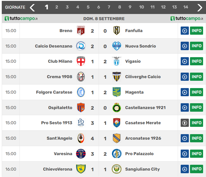 Nel turno domenicale d’apertura del Girone B di quarta serie bisogna segnalare il poker casalingo del Sant’Angelo con l’Arconatese: i rossoneri vanno sul 2-0 a fine primo tempo, ma poi arriva il rigore realizzato da Cavagna per gli ospiti che così accorciano le distanze nel secondo tempo dove c’è spazio anche per la doppietta di Cazzaniga. 3-2 tra Varesina, andata in gol con Bertoli e Sali nei primi 45′ e con Mazia nella ripresa, e Pro Palazzolo con quest’ultimo a segno due volte dal dischetto con l’ex Parma Ceravolo. Il big match Chievo–Sangiuliano termina 1-1: per i gialloblù ha segnato Fiorin all’11’, mentre il pari dei gialloverdi è arrivato con Cocuzza al 44′. L’Ospitaletto ha centrato la porta due volte tra le mura amiche con la Castellanzese che ha subito un gol lampo di Messaggi oltre a quello di Guarneri nella seconda metà di partita. La Folgore Caratese ha perso in casa 1-2 contro il Magenta: Ngom ha fatto gol per i biancazzurri, mentre per i milanesi l’ha insaccata Mascheroni. Decisiva l’autorete casalinga della ripresa. Il Breno porta a casa i tre punti con il Fanfulla al Tassara con due reti nei secondi 45′. In casa Desenzano l’ex Milan Paloschi su rigore e il gol in extremis di Camarlinghi stendono gli ospiti del neopromosso Sondrio che è stato anche in superiorità numerica per un rosso ai danni di un giocatore gardesano. Il Club Milano stecca il debutto tra le mura amiche: vince 1-2 il Vigasio e dunque non basta la rete dagli 11 metri di Rankovic. Infine è patta tra Crema e Ciliverghe con una rete e un’espulsione a testa.