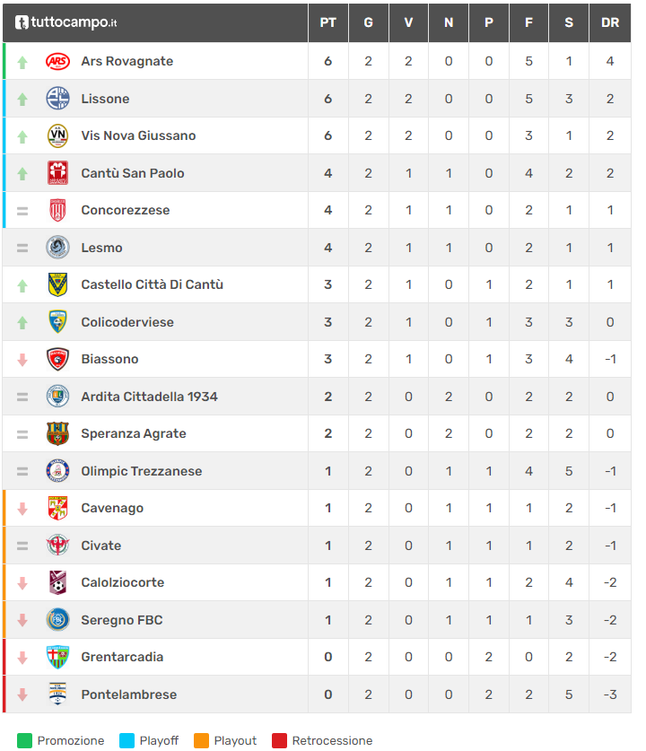 Il Rovagnate accompagna Lissone e Giussano in vetta alla classifica a quota 6 punti: infatti i biancorossi hanno collezionato un altro bottino pieno tra le mura amiche, dopo quello di misura contro il Civate nello scorso turno, battendo il Biassono per 4-1 con la doppietta del classe 01′ Zorloni e le reti dell’attaccante Dorato e dell’esperto centrocampista Donghi con quest’ultimo ancora in gol dopo il sigillo della partita precedente. Per gli ospiti ha invece segnato il classe 00′ Marinaci. Nella gara tutta lecchese tra ColicoDerviese e Calolziocorte è stata decisiva una tripletta di Farina, attaccante classe 1996 gialloblù che si è scatenato subentrando nella ripresa siglando due rigori oltre ad un gol su azione. La risposta amaranto si è potuta vedere con Isaac Baho, elemento offensivo classe 00′ che aveva portato in vantaggio i suoi nel primo tempo, ma non è bastata per evitare la sconfitta che arriva dopo il prestigioso punto casalingo contro il Seregno, squadra che ha anche giocato tra i professionisti negli ultimi anni. Domenica 22 settembre per il Calolzio ci sarà il derby tra le mura amiche contro l’ostico Rovagnate. Mentre per la ColicoDerviese si tratta dei primi tre punti realizzati in questo torneo in attesa della partita del prossimo turno a Cantù. La sfida in terra comasca con l’Ardita Cittadella si è chiusa con un 1-1 per il Civate che così raccoglie il primo punto stagionale con la firma di Franceschini nel secondo tempo in reazione al penalty trasformato da Forno nella prima parte di match. Sperti è stato infine l’uomo partita nell’incontro vinto dalla Vis Nova Giussano in casa contro la GrentArcadia che così viene battuta nuovamente 1-0 considerando anche la precedente sconfitta a Concorezzo e rimane a secco di punti stazionando in fondo alla graduatoria assieme alla Pontelambrese, che sarà la prossima avversaria della compagine lecchese in occasione del debutto casalingo in campionato.