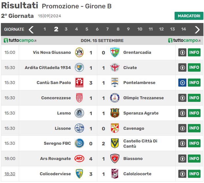 Di seguito i risultati della seconda giornata del girone B di Promozione lombarda e la classifica di quest’ultimo: