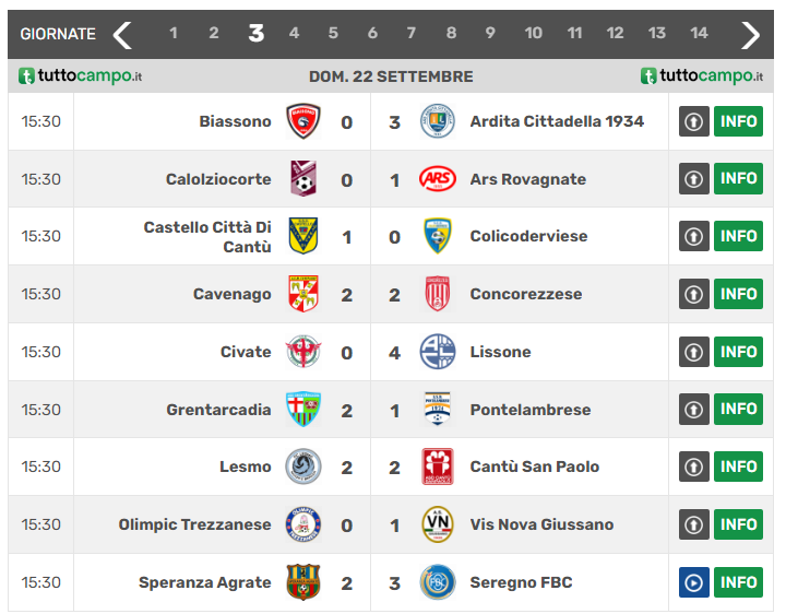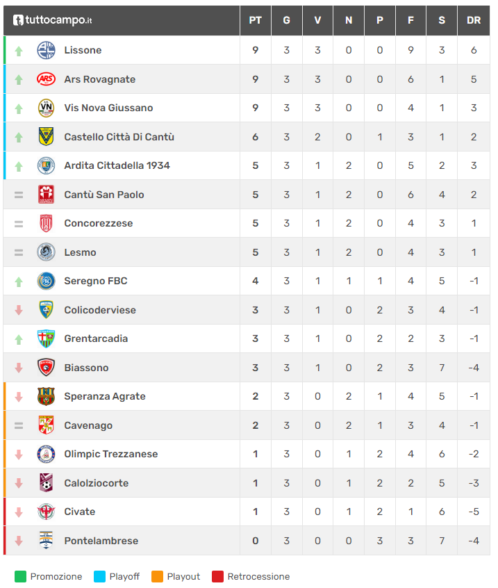 Il Giussano, grazie alla rete del giovane centrocampista Malinverno, ha superato di misura la Trezzanese che giocava in casa: in questo modo i brianzoli centrano la terza vittoria di fila in campionato e mantengono il primato. Il Biassono viene sconfitto tra le mura amiche dall’Ardita Cittadella che cala il tris con il sigillo di Manfrin nella prima parte seguito dalle marcature di Forno e Azzoni nel secondo tempo. Cavenago–Concorezzese e Lesmo–Cantù San Paolo finiscono entrambe con il risultato di 2-2: nella prima gara da segnalare le reti di Riso e Spadoni per i padroni di casa e di Dossena e Lo Re per gli ospiti, mentre nella seconda da considerare soprattutto la doppietta del classe 03′ Cima Vivarelli per i biancorossi. Gara pirotecnica in Brianza tra Agrate e Seregno terminata con la vittoria degli azzurri, che hanno così raggiunto il primo successo stagionale, per 2-3: decisiva una rete su rigore di Papapicco nel secondo tempo.