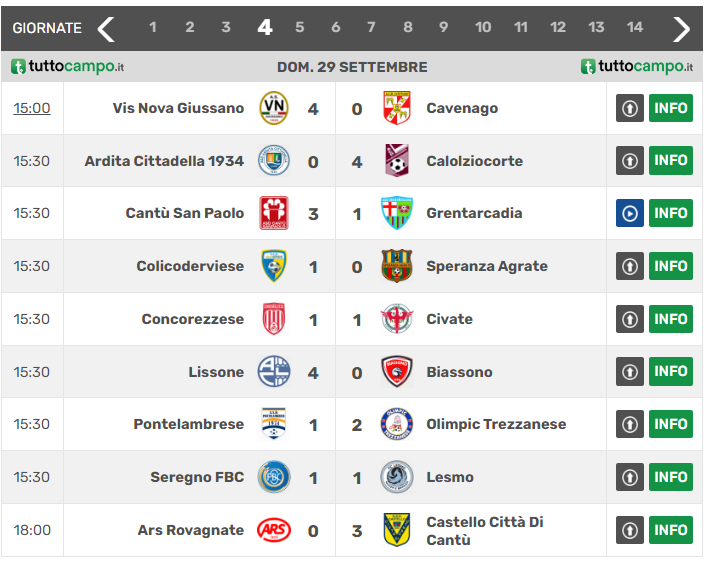 Lissone e Giussano, che detengono il primato in classifica, rifilano dei poker casalinghi rispettivamente a Biassono e Cavenago. La Pontelambrese rimane a secco di punti in classifica vista la sconfitta tra le mura amiche per 1-2 contro la Trezzanese. Seregno e Lesmo si dividono la posta in palio con un 1-1 finale.